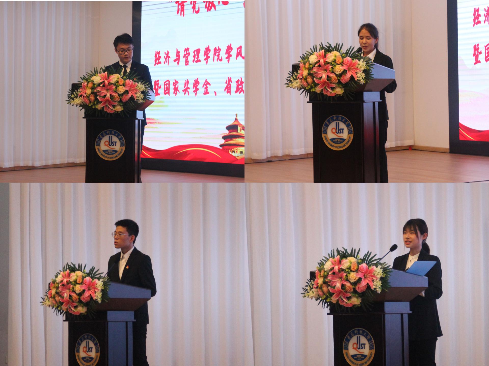 启动仪式上,团委书记王聪宣读了《关于开展“请党放心 强国有我”mg冰球突破豪华版网址学风建设月的通知》。团委副书记张显全宣读了《mg冰球突破豪华版网址获得省级以上荣誉称号名单》,党委副书记刘跃宁、副院长宫攀为获得省级以上荣誉称号的学生颁奖,2019-2020学年国家/省政府奖学金获得者代表物流182班彭承琪、财务181班王倩、工业182班高广旭分别做了经验交流和成果汇报。