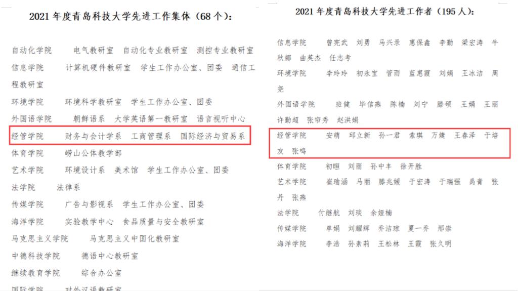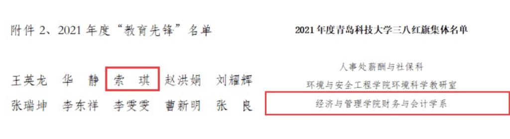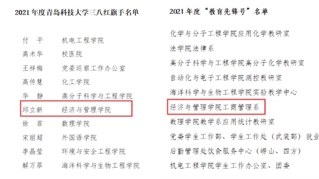 近日,2021年度mg冰球突破豪华版网址先进集体、先进工作者、教育先锋号、教育先锋、三八红旗手、三八红旗集体评选结果揭晓,冰球官网3个集体及8名教师在上述各类评比中均摘得荣誉,其中财务与会计学系、工商管理系、国际经济与贸易系获评校“先进工作集体”,安萌、邱立新、孙一君、索琪、万婕、王春泽、于培友、张鸣老师获评校“先进工作者”,邱立新老师获校“三八红旗手”称号,财务与会计学系获评“三八红旗集体”,索琪老师获评“教育先锋”,工商管理系获评校“教育先锋号”称号。