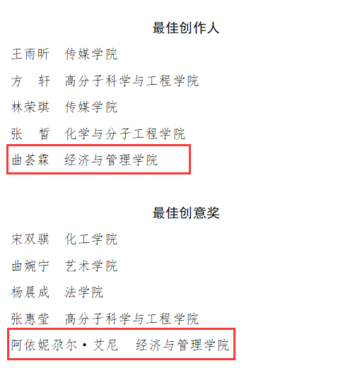 其中,2021级ACCA专业曲荟霖的作品“‘张灯结彩迎新年,齐心协力谱新篇‘喜迎新年”获二等奖并评得“最佳创作人”,2019级城市管理专业阿依妮尕尔·艾尼作品获最佳创意奖,2021级研究生戚豪越及2021级本科生汤馨洁等16人作品获“网络人气奖”。