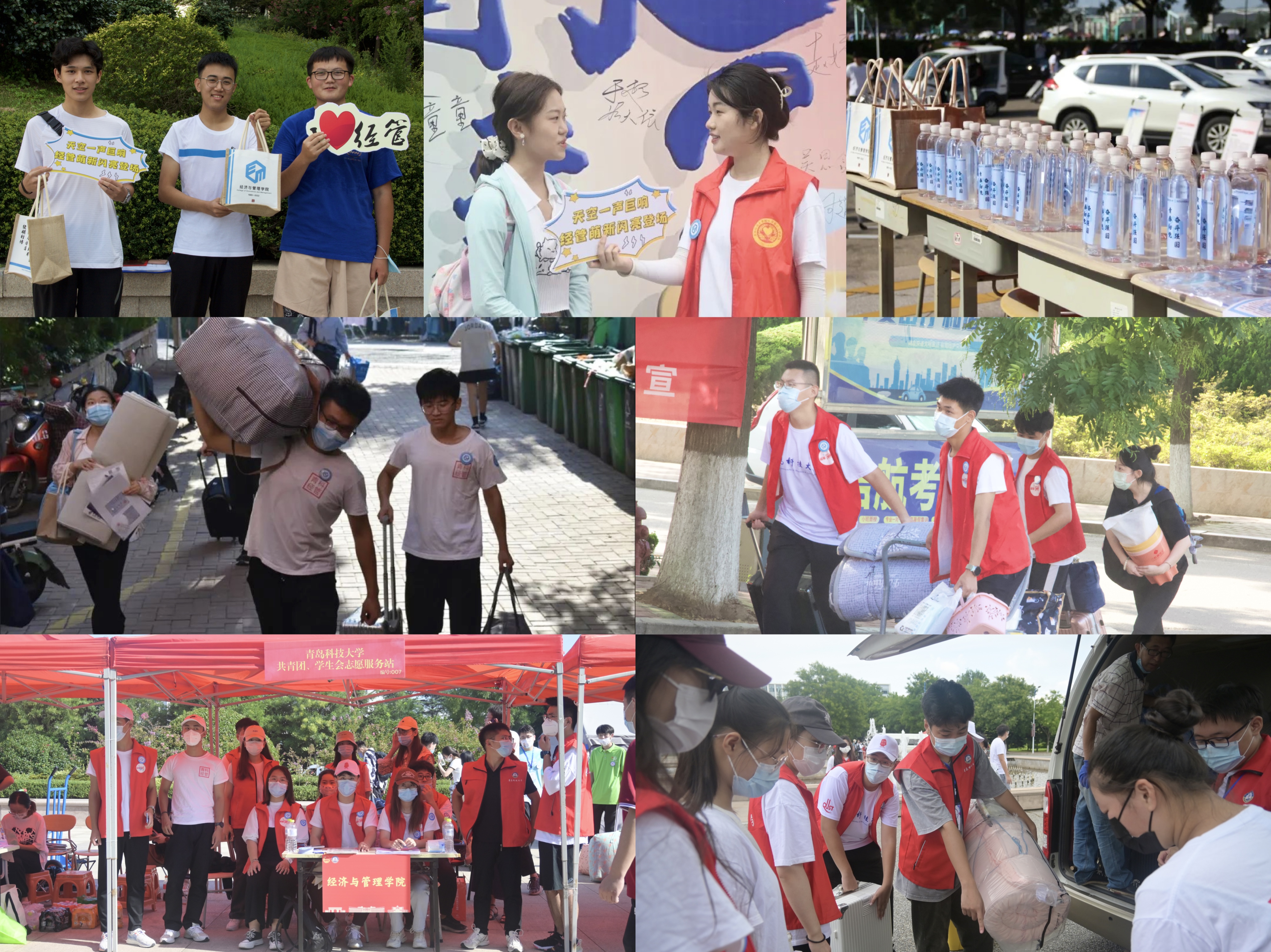 全心服务,周密细致传递经管温度。学院多次召开迎新志愿者培训会,学生会分部门进行工作切块,确保各项任务都能落实到位;迎新当天百余名学生骨干、党员积极分子和普通同学主动作为、担当尽责,将“志”内化于心,“愿”外化于行, 加入学院迎新志愿服务队,为新生提供“点对点”帮助。早上六点,志愿者在学校东门、西门、弘毅广场、宿舍楼下等位置全部就位,迎接新生入校,帮助新生搬运行李,不让一个新生落单。报到现场,学院设置党员先锋岗、绿色通道专区,为全体新生发放“经”心新生大礼包、防疫物资、清凉贴等暖心物品,设置朋友圈打卡背景板、手持KT板、“大学初印象”之新生采访等具有学院特色的迎新活动,让新生感受到浓浓的“经管情”。