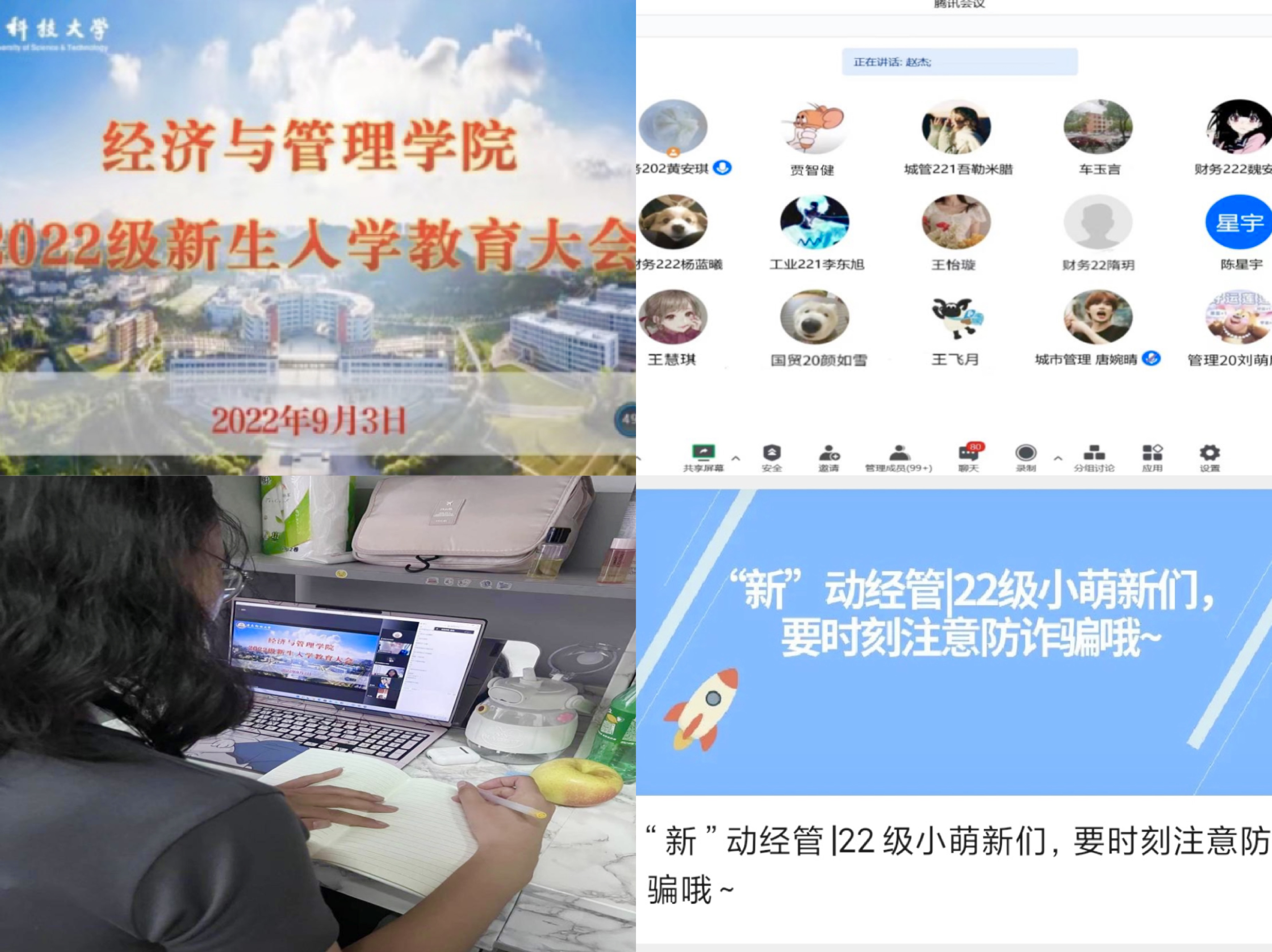 全情投入,做好新生的思想领航人。2022年迎新季,学院利用官方微信平台开设“‘新’动经管”迎新专栏,发布新生报到须知、学院及专业简介大学校园生活、心理安全及防诈骗知识科普等内容,帮助新生提前融入大学环境新氛围;辅导员撰写“致全体2022级经管学子的一封信”,为新生送上开学前的第一份祝福;在官方抖音号进行迎新现场直播,方便新生家长实时关注新生入校报到的流程动态,走好家校合育第一步;根据疫情防控要求,新生入学后第一时间召开“青春向党,奋斗强国”线上教育大会,帮助新生强化专业认知与未来规划意识,开展爱校荣校教育,厚植新生爱国主义情怀,上好新生第一堂“思政课”。