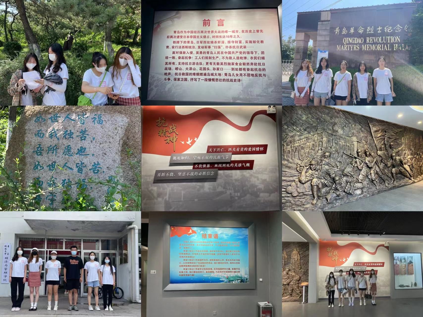 七月八日,社会实践成员前往青岛革命烈士纪念馆进行参观学习。“山河魂”烈士群雕坐落于纪念馆中坪广场正中央,烈土群雕以党的一大代表、青岛党组织创建人邓恩铭为原型,周围并肩站立着工人、学生、农民及童工代表,象征着不屈不挠的青岛人民在中国共产党领导下开展的波澜壮阔的革命斗争,同时也喻示着英烈的丰功伟绩与山河共存、与日月同辉。