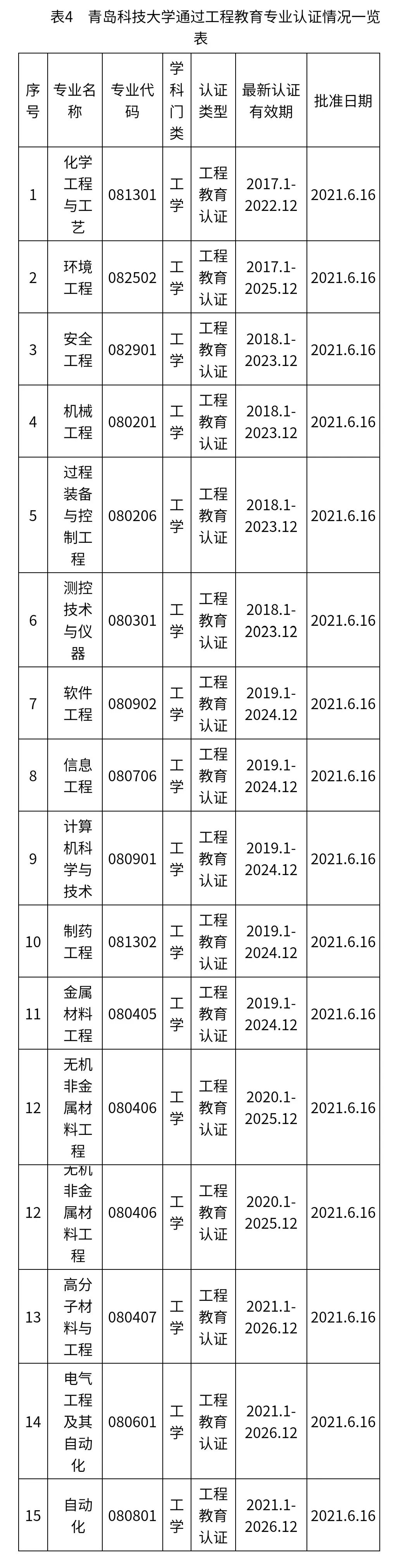 第十次党代会召开至今,学校先后新增7个新工科专业,另有3个新工科专业新增申请已于本年度上报教育部。目前全校共有76个本科专业,其中在招专业72个,涵盖理、工、文、经、管、医、法、艺、教9个学科。专业认证成绩优异,截至目前,学校共有15个专业18次通过工程教育专业认证(表4),位居全国高校并列第25位、省属高校第2位,学校专家、教师主编的《高校工程教育专业认证工作参考手册》在高等教育出版社出版。