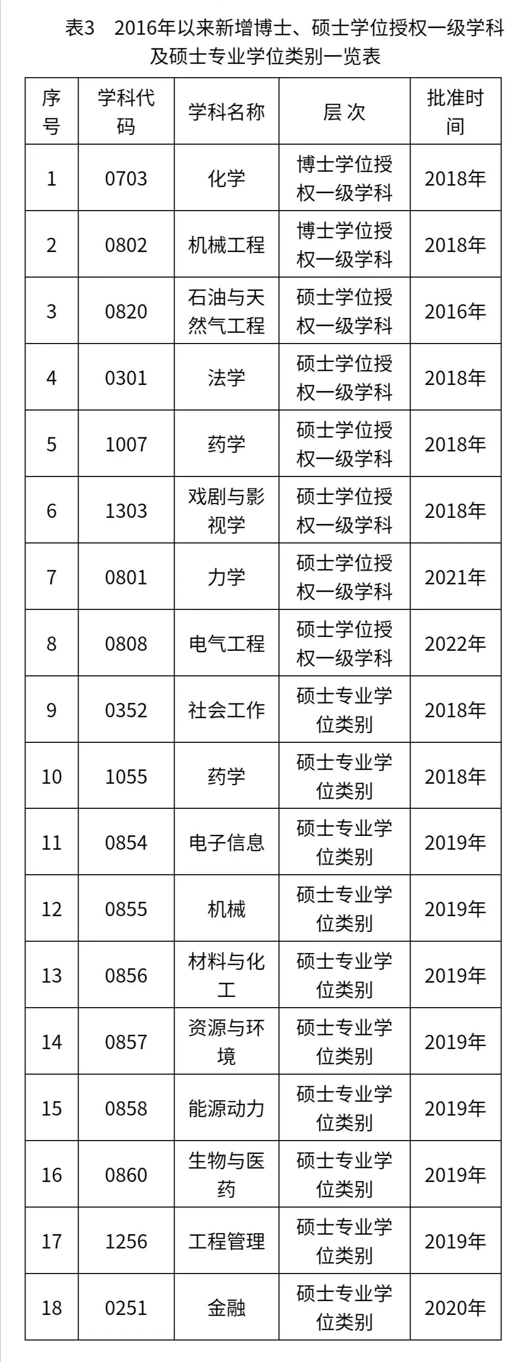 自2016年以来,学校获批化学、机械工程2个博士学位授权一级学科,法学、药学、戏剧与影视学、力学、电气工程5个硕士学位授权一级学科,社会工作、药学2个硕士专业学位类别。在工程硕士专业学位授权点对应调整工作中,将12个工程领域调整成电子信息、机械、材料与化工、资源与环境、能源动力、生物与医药、工程管理7个专业学位类别。学校坚持“有所不为”原则,主动撤销发展前景不好的精密仪器及机械、情报学2个硕士学位授权点,对应调整增列石油与天然气工程、金融2个硕士学位授权点(表3)。截至目前,学校共有5个博士学位授权一级学科,24个硕士学位授权一级学科,16个硕士专业学位类别,实现了各教学学院硕士一级学科授权点全覆盖。