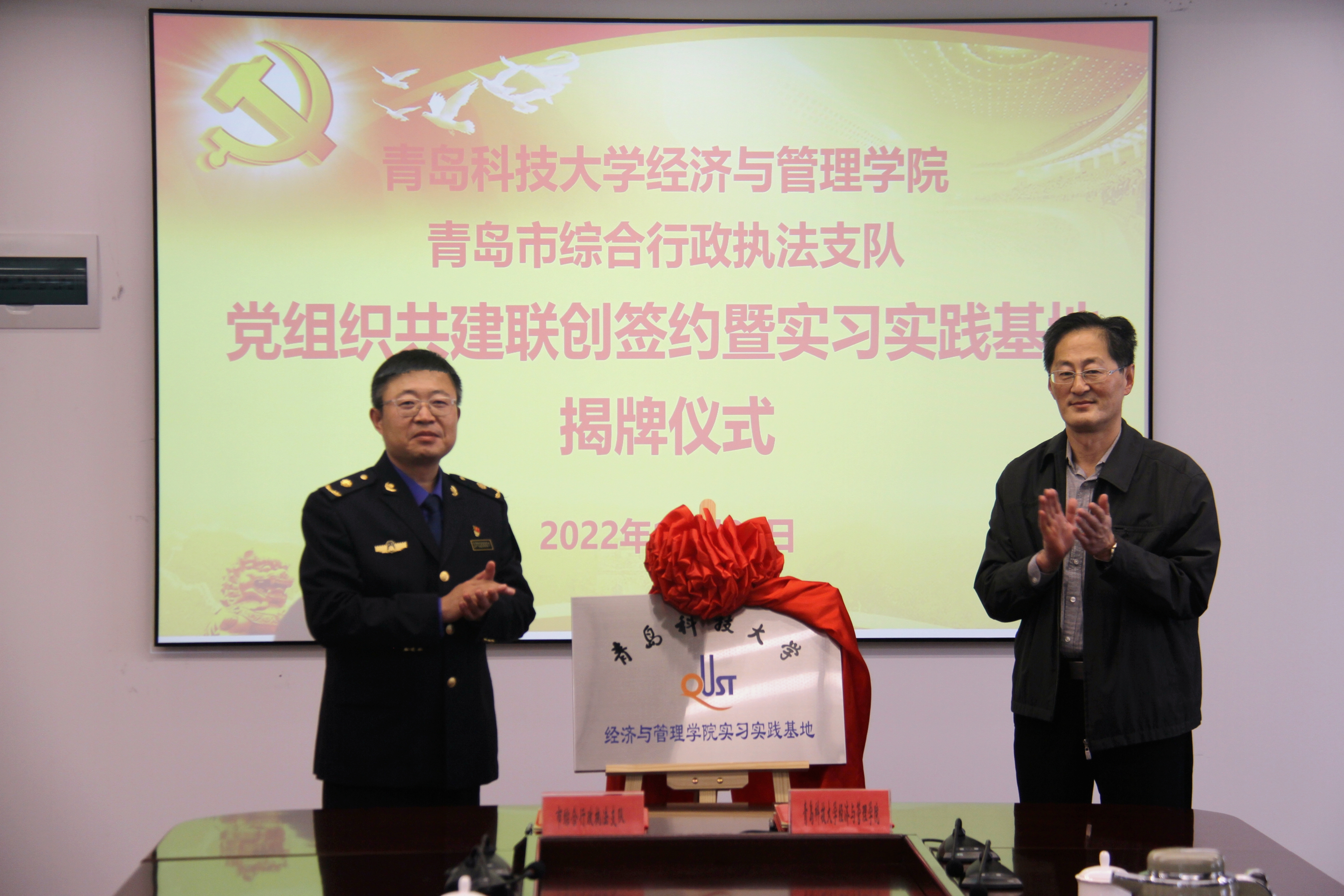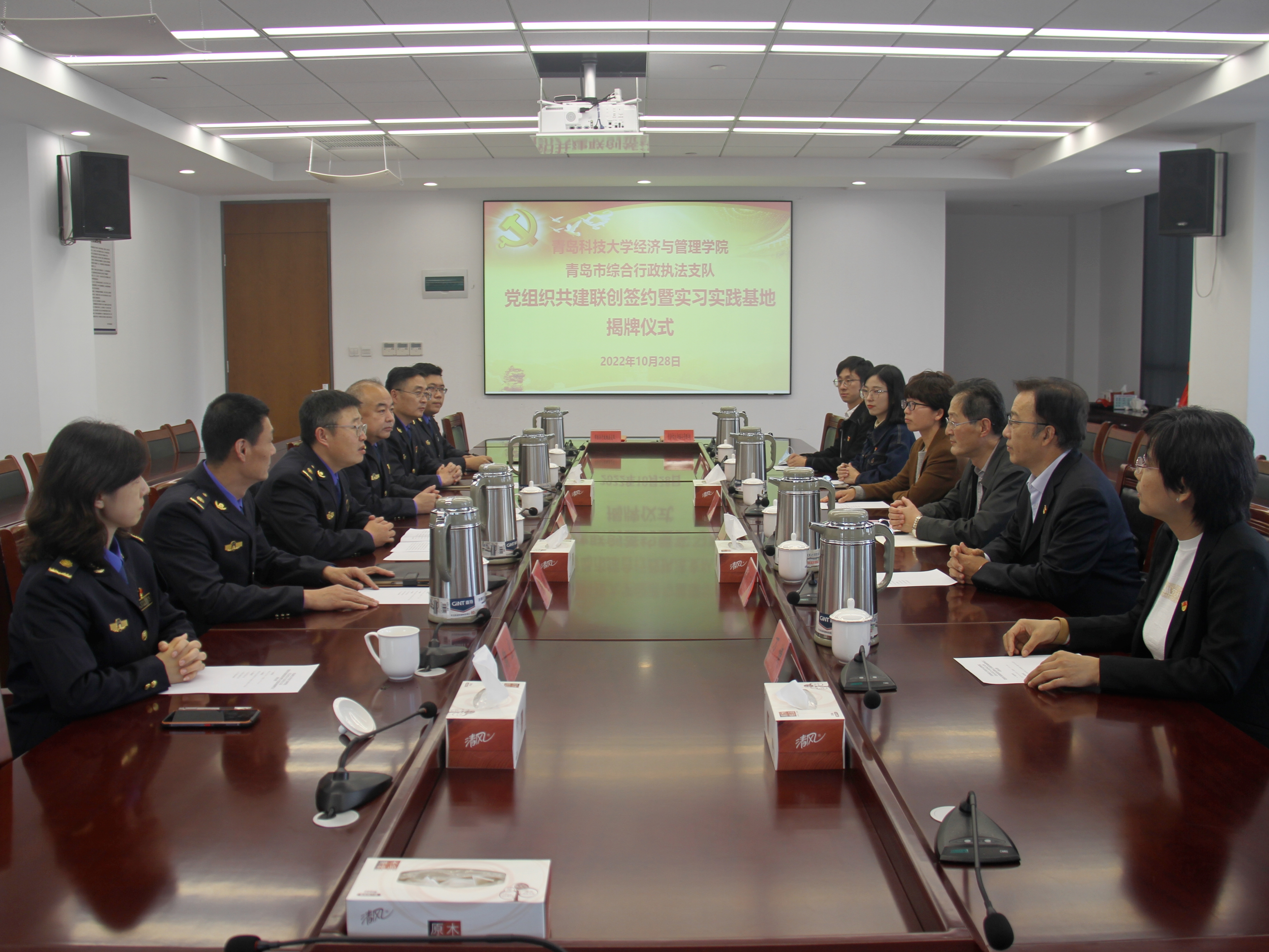 为贯彻落实学校第十一次党代会精神,深入推进党建引领产学研融合、协同育人的合作人才培养模式,10月28日下午,mg冰球突破豪华版网址与青岛市综合行政执法支队举行党组织联创共建合作签约暨实习实践基地揭牌仪式。mg冰球突破豪华版网址党委书记李德成、副院长宫攀,青岛市综合行政执法支队党委书记、支队长王博彤、副支队长任树睿及双方有关负责同志参加签约揭牌仪式。