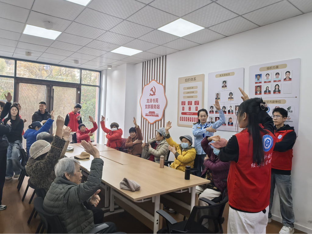 活动现场,志愿者围绕冬季气候特点,用通俗易懂的语言拆解实用养生技巧。针对冬季防寒保暖,重点分享了衣物穿搭、室内保暖的科学方法,提醒老年人尤其注意颈部、腰部等关键部位防护;在饮食管理方面,结合时令食材推荐了多款养生粥品,强调“温补为宜、忌生冷寒凉”的饮食原则;针对高血压、糖尿病等常见慢病,讲解了冬季病情防控要点,指导居民通过合理作息、饮食调控降低发病风险。理论讲解后,志愿者带领现场居民开展沉浸式养生健身操实践体验,既活动了关节、促进了血液循环,又缓解了冬季久坐带来的不适。