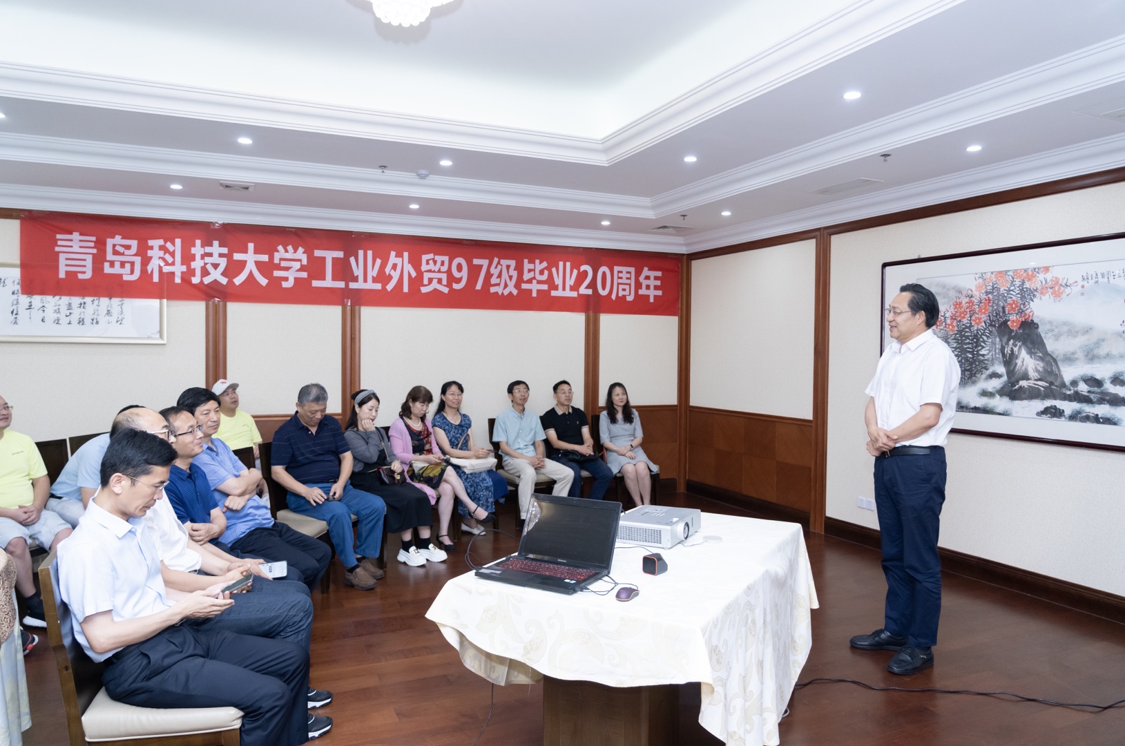 7月16日下午,工业外贸(现国际贸易)97级校友毕业20周年聚会仪式在青岛八大关宾馆举行。学校副校长、校友总会常务副会长韦殿华,mg冰球突破豪华版网址院长李勋来,学院原领导李利、杜裕禄,时任学院分团委老师丛松涛、刘伟、肖强,时任任课老师蔡苏文、岑彩云、张同功、陈岩、任燕应邀参加仪式。