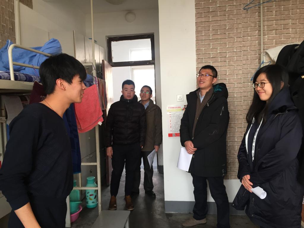 1月12日,mg冰球突破豪华版网址党总支副书记兼副院长刘跃宁、分团委书记高洪涛、全体分团委老师深入宿舍开展学生寒假离校前安全检查,强化学生离校安全防范意识,并看望慰问住宿学生。