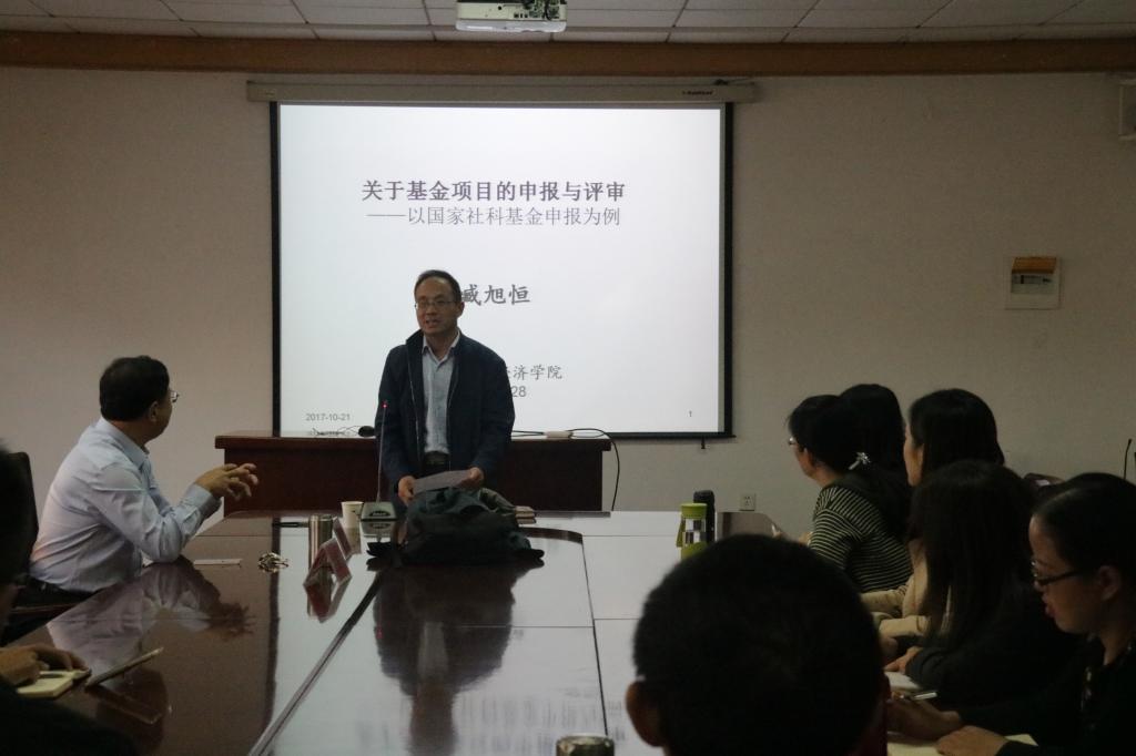2017年10月21日下午,mg冰球突破豪华版网址313会议室,mg冰球突破豪华版网址特聘教授臧旭恒老师为冰球官网全体老师带来了题为《国家社科基金的撰写以及注意事项》的精彩报告,报告会由人文社科处处长李勋来主持,mg冰球突破豪华版网址副院长杨友才以及mg冰球突破豪华版网址、马克思学院、法学院、传播学院等人文学院的老师参加了此次报告会。