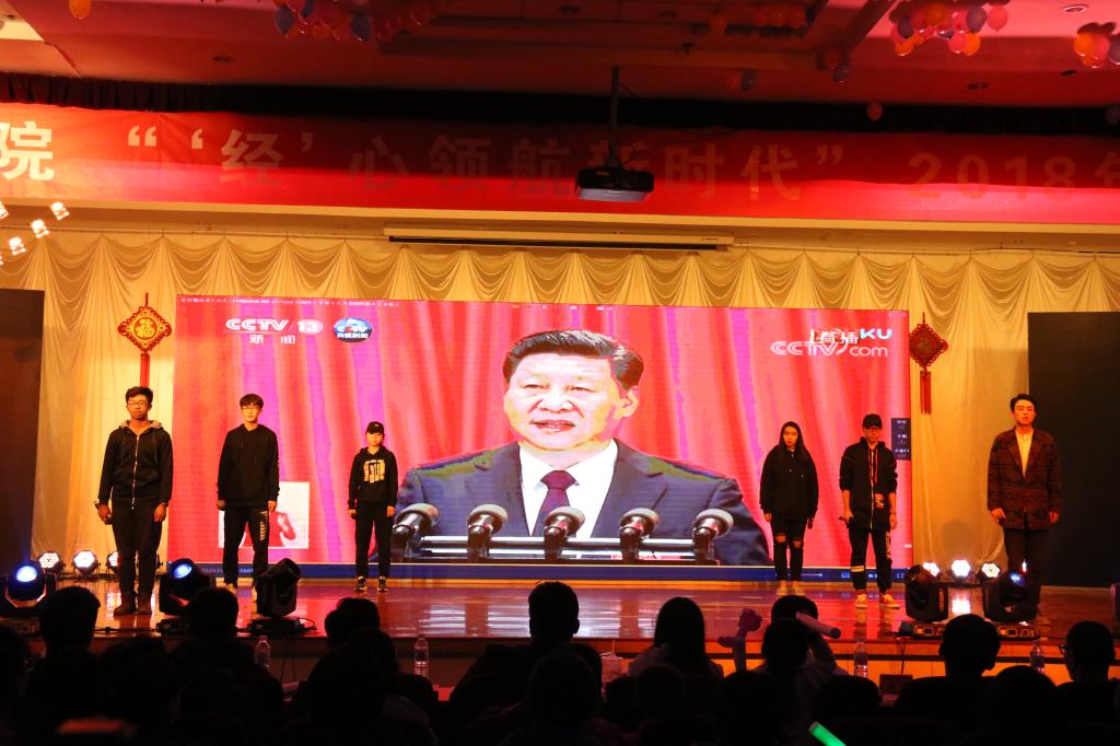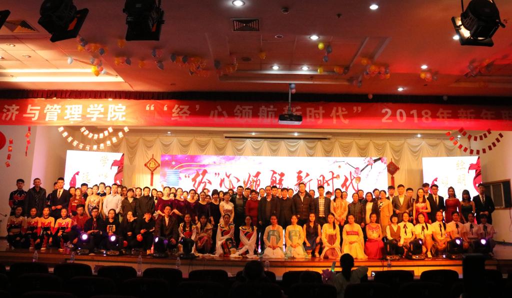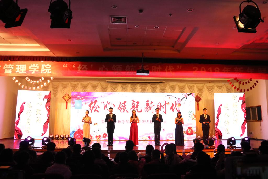 为弘扬十九大精神,展青春朝气,凝聚发展正能量,12月22日晚,以“‘经’心领航新时代”为主题的mg冰球突破豪华版网址2018年新年联欢晚会于崂山校区第二报告厅成功举行。校工会主席郭曰铎、学生处副处长周宪锋、教务处副处长王泽鹏、保卫处副处长严增兴、团委副书记杨小明、mg冰球突破豪华版网址院长王志宪、mg冰球突破豪华版网址党总支书记聂法良、学院其他党政领导、学院全体老师、兄弟学院老师代表、校院学生会主席及学生代表共800余人共同观看了本次晚会。晚会由mg冰球突破豪华版网址分团委、学院分工会承办。