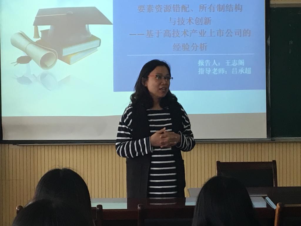 论坛开始,2016级研究生代表王志阁向在座师生汇报了题为《要素资源错配、所有制结构与技术创新--基于高技术产业上市公司的经验分析》的论文,该论文主要分析了要素资源错配在促进短期经济增长的同时,与高技术产业技术创新的关系及影响。吴成锋、王裕瑾、周南南等教师代表对论文做了精彩的点评,并提出了中肯的建议。