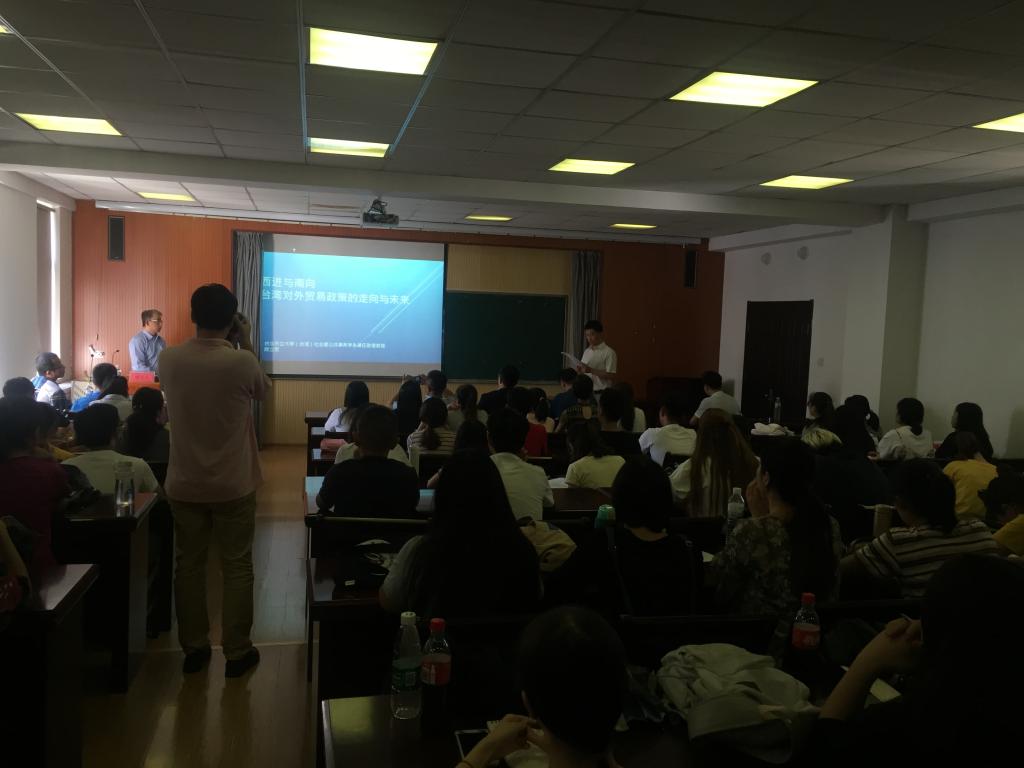 首先演讲的是mg冰球突破豪华版网址的特邀嘉宾——台北市立大学顾立民教授,杨友才副院长对顾教授作了简要的介绍并代表学院对顾教授到来表示热烈的欢迎!顾教授为大家做了题为《西进与南向—台湾对外贸易政策的走向与未来》的精彩报告。其主要内容包括五部分:台湾对外贸易的特质与发展过程;台湾与大陆的贸易现状;台湾与东南亚地区的贸易现状;蔡英文新南向贸易政策现状与困境;两岸的合作互利。顾教授认为,台湾新南向政策的实施将面临很大的困境,台湾未来的出路是:加强和大陆合作,实现合作共赢。