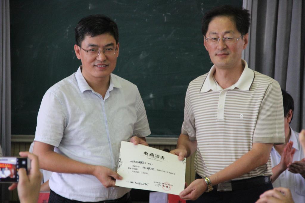 2011级校友捐赠地球仪,李德成教授为他颁发收藏证书,李德成指出感谢校友们的慷慨助学,学院将严格按照捐助者的意向和学校教育发展基金会的规定,将基金全部用于资助贫困学生,奖励品学兼优的学生,做到账目清晰,绝不挪用,请校友们放心。