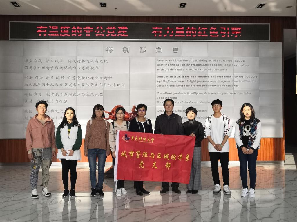 2018年11月1日,为学习贯彻“弘扬爱国奋斗精神、建功立业新时代”活动,mg冰球突破豪华版网址城市管理与区域经济系党支部及城市管理专业学生党员,在总支书记李德成的带领下,来到青岛特锐德“生态党建”基地进行特色党日活动。
