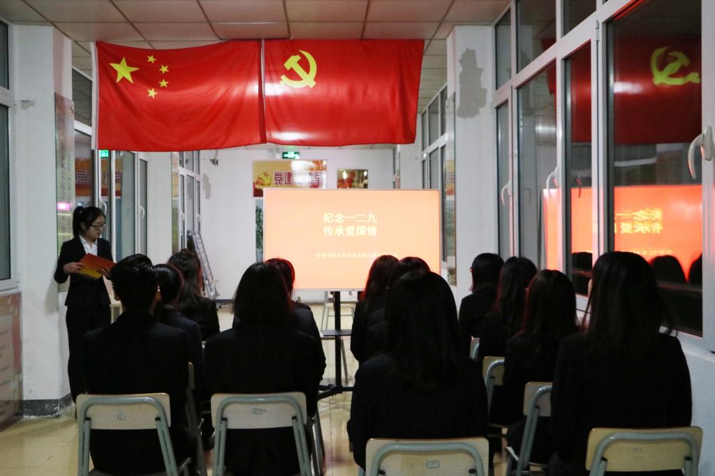 心系国魂,传承爱国情。学院学生党支部在“领航”党建活动室开展“铭记一二•九,传承爱国情”主题党日活动,通过观看纪律片和朗诵的形式回顾历史,缅怀先烈,学习革命烈士甘于奉献、不怕牺牲的大无畏精神。学生党员徐敏表示,我们要永远铭记一二九这个日子,勿忘国耻,砥砺前行,让爱国从今天做起,从点滴做起,学好本领,为实现中华民族伟大复兴而努力。