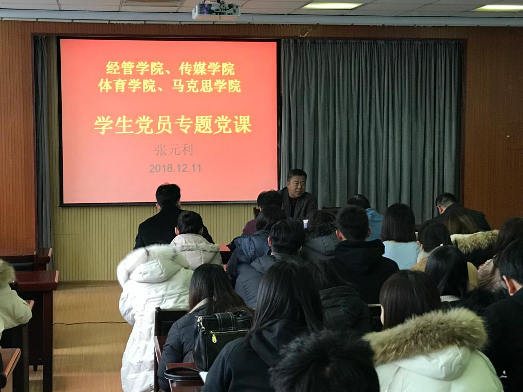 12月11日下午,在崂山校区南区2号楼mg冰球突破豪华版网址419会议室,学校党委副书记张元利以“改革开放四十年”为题讲授专题党课,mg冰球突破豪华版网址、传媒学院、马克思主义学院、体育学院党总支书记、专兼职辅导员、学生党员100余人参加党课学习。