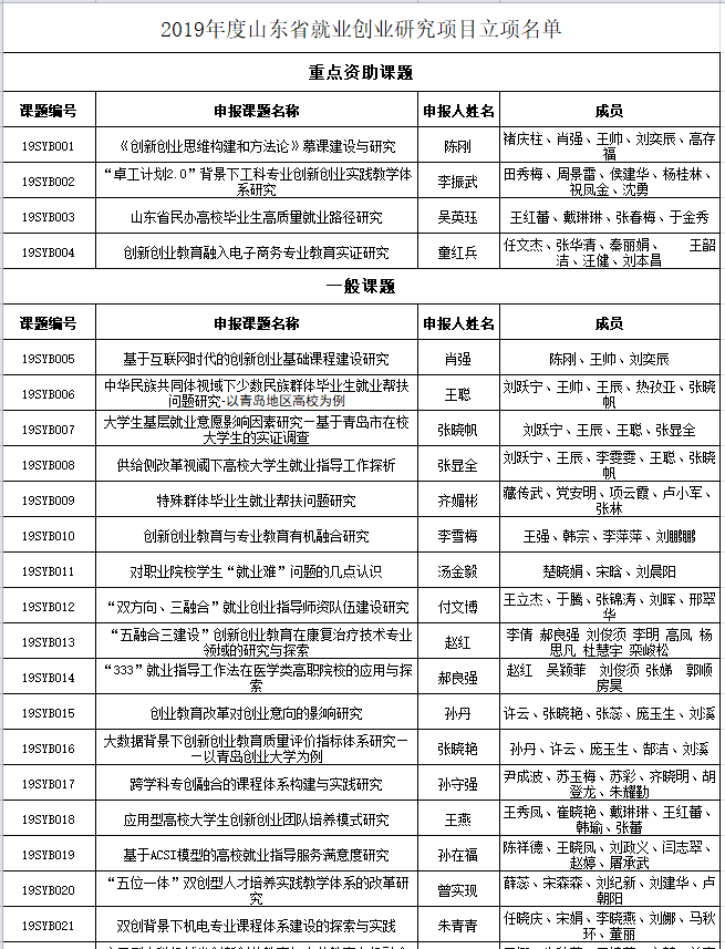 为全面贯彻习近平新时代中国特色社会主义思想和党的十九大精神,全面贯彻全国教育大会精神,突出加强就业创业理论研究的前瞻性、应用性和实践性,进一步提升就业创业工作水平,山东省社会科学基金委员会于2019年2月组织启动2019年山东省就业创业研究项目申报工作。近日,经专家评审,最终确定山东省就业创业研究项目立项40项,重点资助课题4项。mg冰球突破豪华版网址报送的项目中华民族共同体视域下少数民族群体毕业生就业帮扶问题研究-以青岛地区高校为例、大学生基层就业意愿影响因素研究—基于青岛市在校大学生的实证调查、供给侧改革视阈下高校大学生就业指导工作探析获批立项,取得3个立项的好成绩。