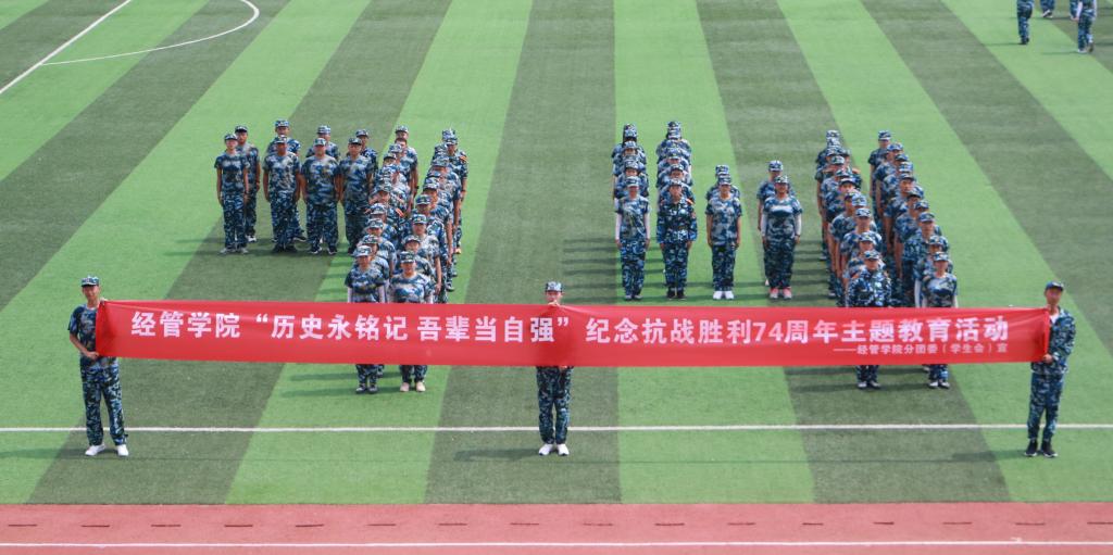 争做奋斗者,开学再出发。针对刚刚入学的大一新生,学院把思想引领教育放在首位,身着军训服的新生在操场上摆出“74”字样,纪念中国人民抗日战争胜利74周年。新生代表城管192班杨博表示“爱国主义始终在是亿万人民心中不变的旋律,也是广大青少年的必修课,我们要接力奋斗,把爱国主义的额热情转化为学习知识、报效祖国的不竭动力,在奋斗中书写无悔人生。”