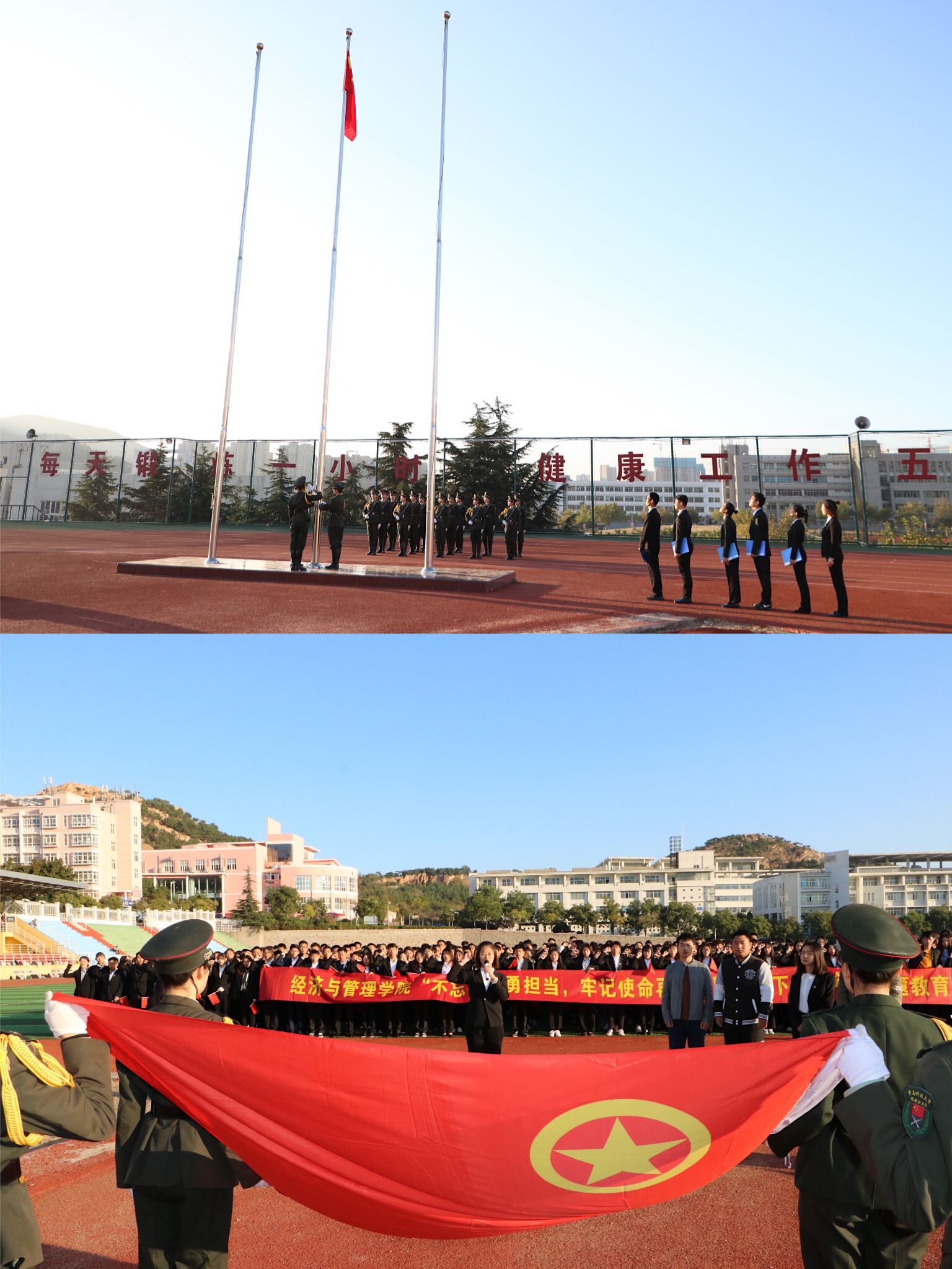为厚植爱国主义思想,引导学生树立远大理想,激发爱国报国情怀,10月15日上午7时,由mg冰球突破豪华版网址主办的“不忘初心勇担当 牢记使命再出发”国旗下青年说主题教育活动于崂山校区运动场如期举行,各年级辅导员和全体学生齐聚国旗下,共同参加这场具有浓浓爱国情的的教育活动。