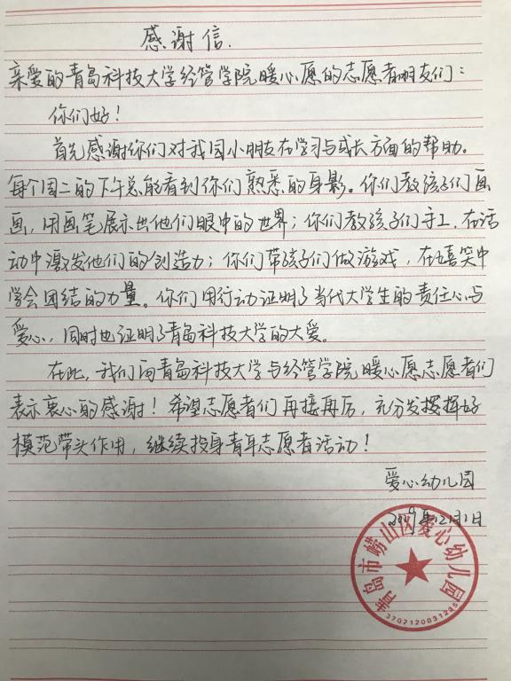近日,青岛市崂山区爱心幼儿园给冰球官网寄来了感谢信,对mg冰球突破豪华版网址暖心愿志愿服务团队的志愿者们长期以来为爱心幼儿园送去的关爱和帮助给予了高度评价和衷心感谢。