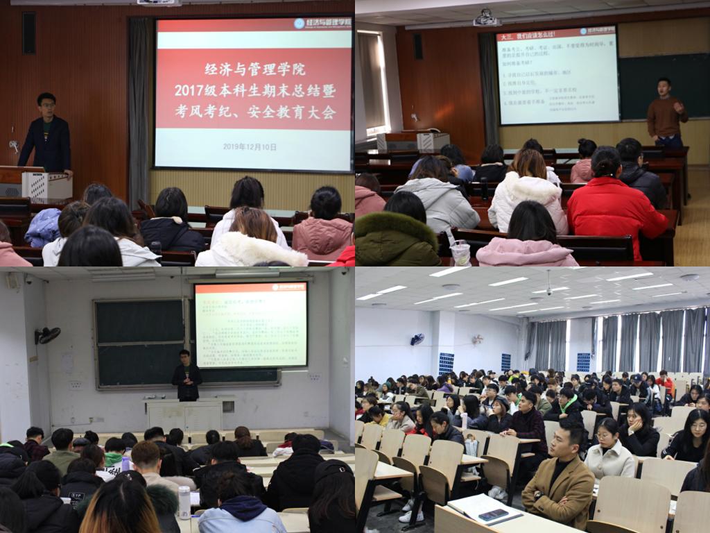 为进一步加强学风建设,严肃考风考纪,提升学生诚信意识,落实学校学院关于期末考风考纪和安全教育的工作要求,12月10日,mg冰球突破豪华版网址2017级本科生于弘毅楼E302室分专业召开期末总结暨考风考纪、安全教育大会。本次大会由17级辅导员张显全老师、马梓轩老师主持,17级全体学生参加。