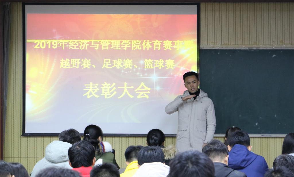 2019年12月13日,mg冰球突破豪华版网址于经管楼419室召开2019—2020学年第一学期体育赛事总结表彰大会。mg冰球突破豪华版网址高守朋老师及全体篮球队、足球队、越野队队员参加了本次大会。会议由学生会体育部副部长高广旭主持。本次表彰大会主要对参与本学期学校组织进行的“育新杯”篮球赛、“育新杯”五人制足球赛、大学生冬季长跑接力赛中表现突出的运动员进行表彰。