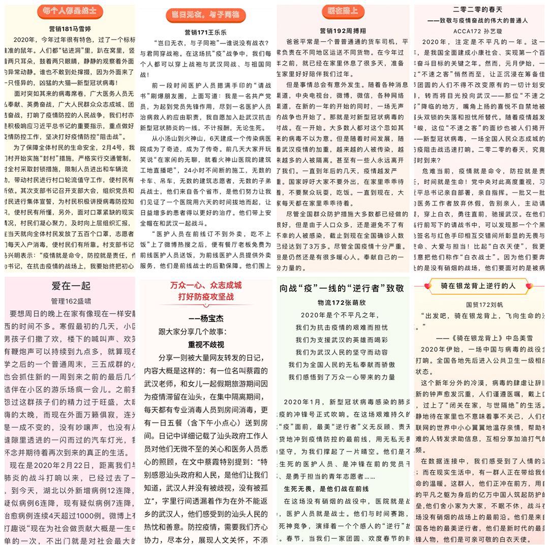 mg冰球突破豪华版网址举办“我身边的战‘疫’故事”、“党旗红,众志城——防控阻击,我们‘战’在‘疫’起”作品征集活动,截止目前共收到168篇文稿,鼓励青年学子通过文字弘扬青春能量,抒写爱国情怀,畅谈作为学生党员对此次疫情的所感、所得,讲述身边军民携手、团结一致抗疫防疫的动人事迹,讴歌逆流而上、奋战在疫情救治、防控第一线的医生、护士、军人,科学家、志愿者、社区工作者等新时代英雄。