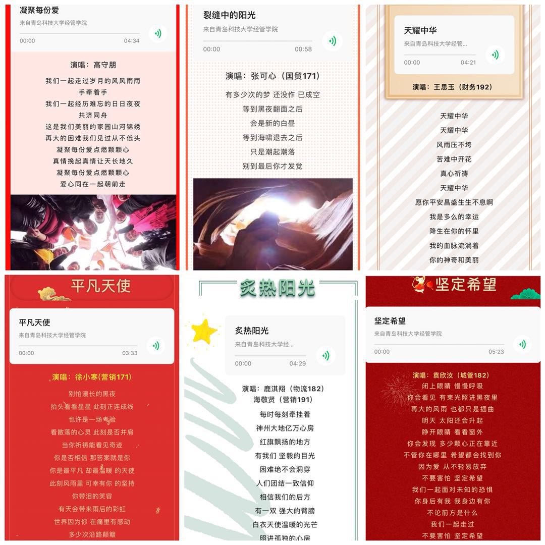 mg冰球突破豪华版网址组织开展“以‘经’心之歌 传战‘疫’之情”活动,教师代表和教师代表和青年学生们通过歌曲录制的形式助力疫情防控宣传工作。其中,18级辅导员高守朋老师歌唱《凝聚每份爱》,致敬可爱的逆行者们,歌颂了他们义无反顾、连夜奋战的崇高精神;物流182班鹿淇翔和营销191班海敬贤合唱《炙热阳光》,用歌声传达了全国人民上下一致抗击疫情的决心,倡导青年学子应时刻不忘初心,牢记力重千钧的使命担当。此外,还有国贸171张可心、财务192王思玉等26名同学,共同为战“疫”献声,以音传情。