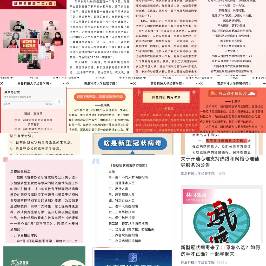 学院始终坚持“立德树人”这一根本任务,创新工作方式方法,发挥新媒体优势,筑牢思政工作的生命线。利用学院官网、微信官微、QQ公众号、易班等线上渠道,及时发布官方疫情防控信息和学校疫情防控最新通知要求,扎实推进正面舆情宣传;充分发挥党支部、团支部作用,开展 “同心同向 共克时艰”主题团日活动,涵盖学院70个团支部、开展“‘经’心聚力,共同战‘疫’”作品征集、“党旗红,众志城——防控阻击,我们‘战’在‘疫’起”主题党日、抗“疫”冲锋党旗扬——mg冰球突破豪华版网址党员“亮身份、走在前、做表率”主题活动,扎实做好学生的思政教育和爱国引领,将润物无声的思想政治工作做到个人、做到心坎。