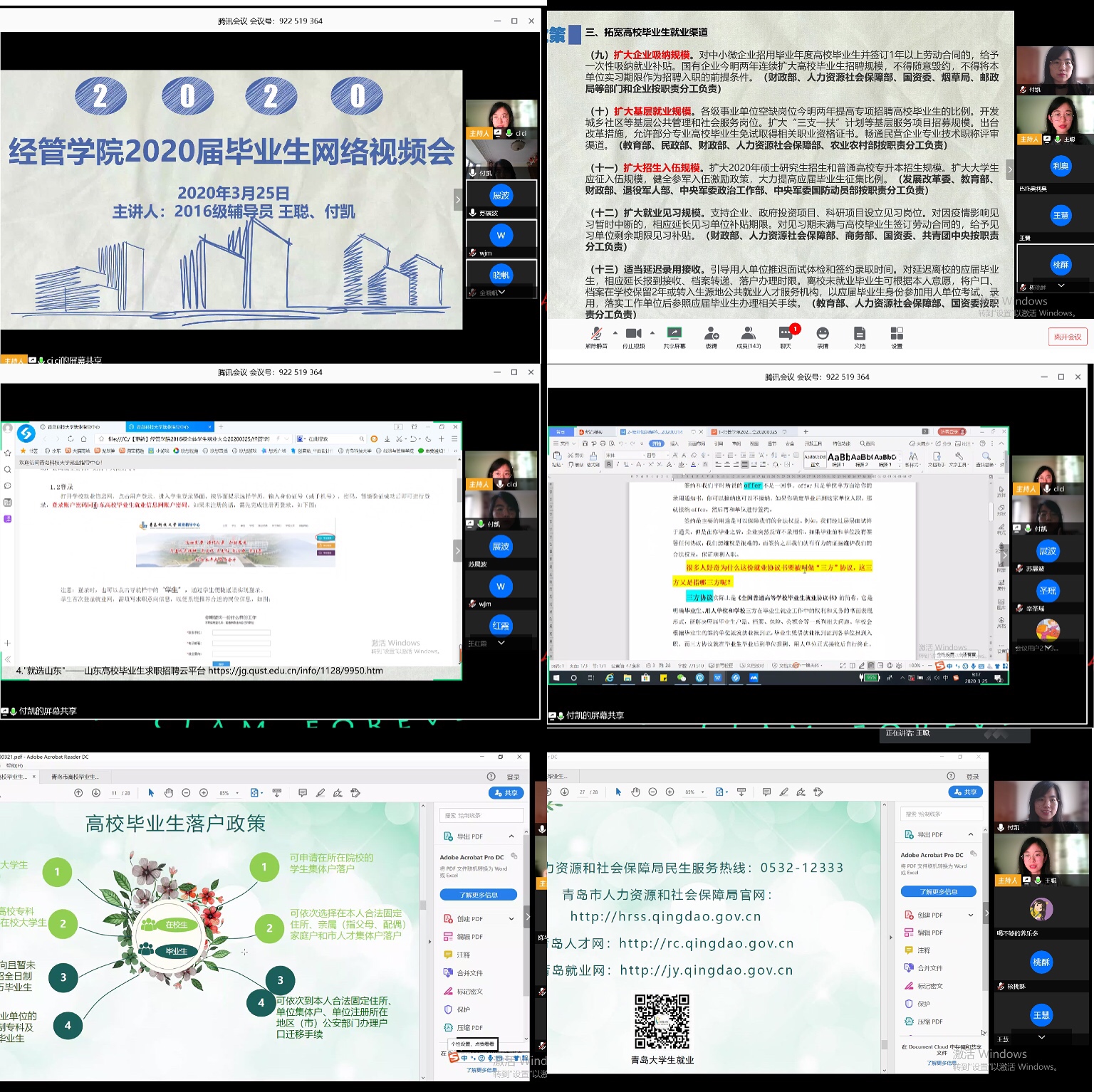 最后,王聪为同学们介绍了学院疫情期间对困难生、少数民族、湖北学生的就业帮扶举措,并针对考研复试和调剂准备,毕业论文撰写,答辩时间安排,成绩、学分确认,党团关系转接,毕业派遣,档案转出,报到证、毕业证及学位证领取等毕业相关事宜做出提醒和说明,同时,再次强调了疫情期间个人防护举措、禁止提前返校和安全信息的及时上报问题。此外,王聪就高校毕业生网络招聘平台、“青岛人社·学历汇”、高校毕业生落后及住房保障、高校毕业生就业、创业政策等五个方面进行就业政策解读,鼓励同学们充分知晓政策、用好政策、享受政策,高质量完成就业。