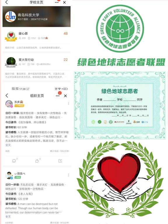 为倡导环保精神,践行绿色发展理念,mg冰球突破豪华版网址暖心愿爱心公益团队于3月12日植树节,组织开展“绿色地球”线上志愿活动,鼓励大家进行每日读书打卡,交流学习心得,并积极传递环保理念,每天分享生活中的环保小方法。随着活动的推广,其他社团也纷纷响应号召,活动期间,暖心愿共召集三百多位成员,累计两千条读书心得及日行一环保打卡记录,展现了当代青年学生应有的使命感、责任感。