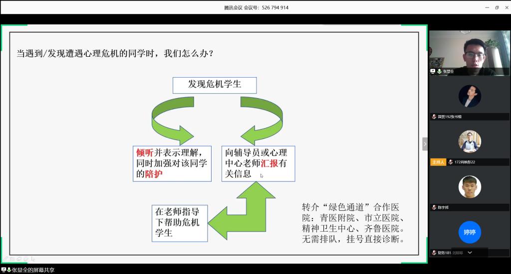 疫情期间,为进一步完善学校、学院、班级、宿舍“四级”心理危机预防联动机制,提高朋辈助人、自助能力,提升学生获得感、幸福感、安全感,充分发挥“心音使者”在心理健康工作中的重要作用,4月21日下午3点,mg冰球突破豪华版网址借助腾讯会议平台举办“心音使者”线上培训会,学院心理工作站王聪、张显全担任主讲老师,2016级、2017级、2018级共计285名“心音使者”参加了培训。