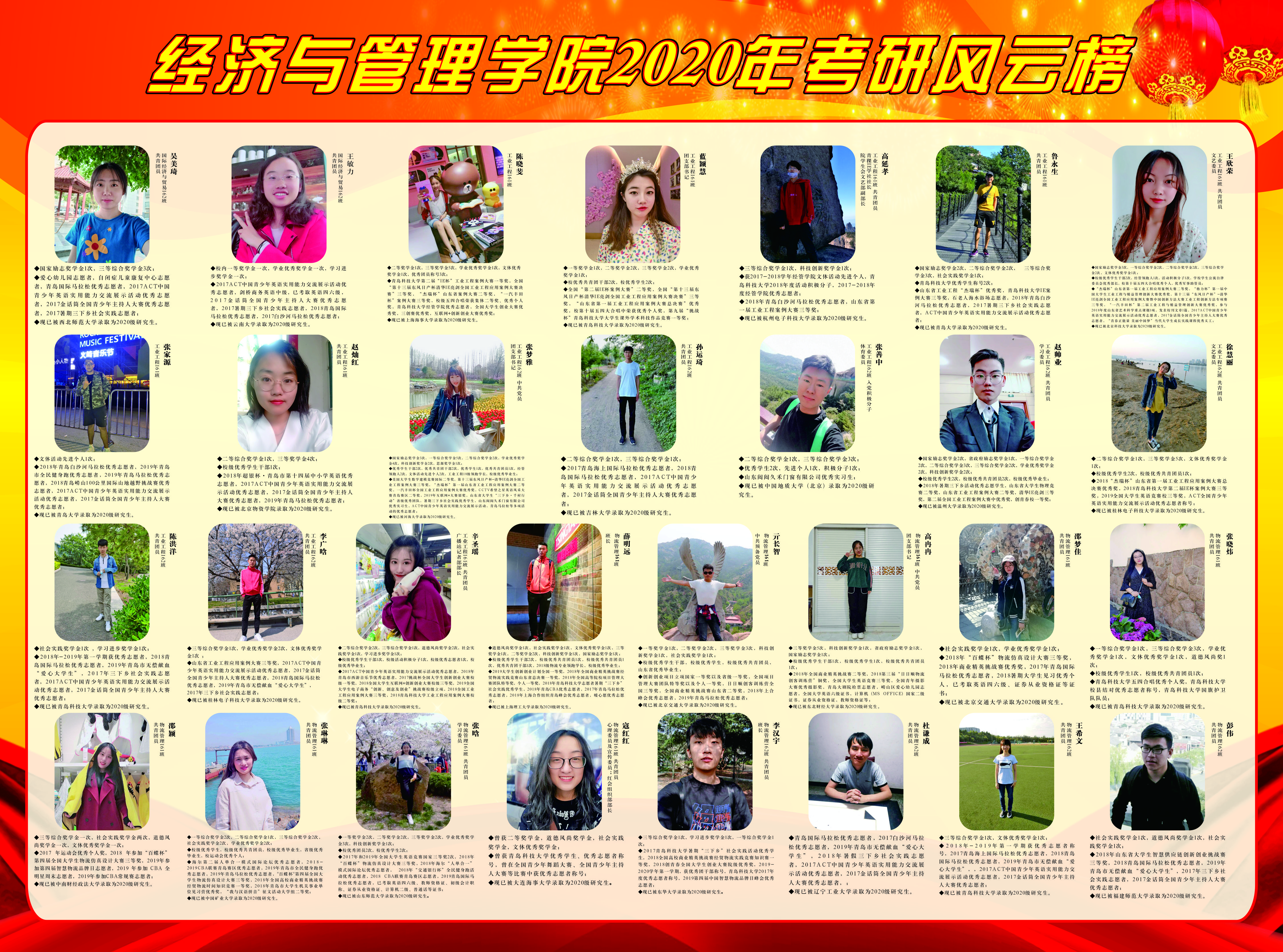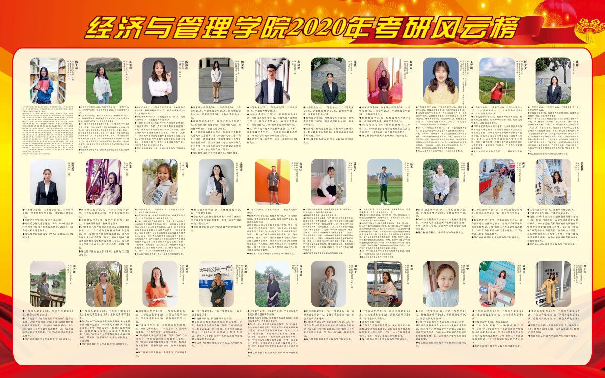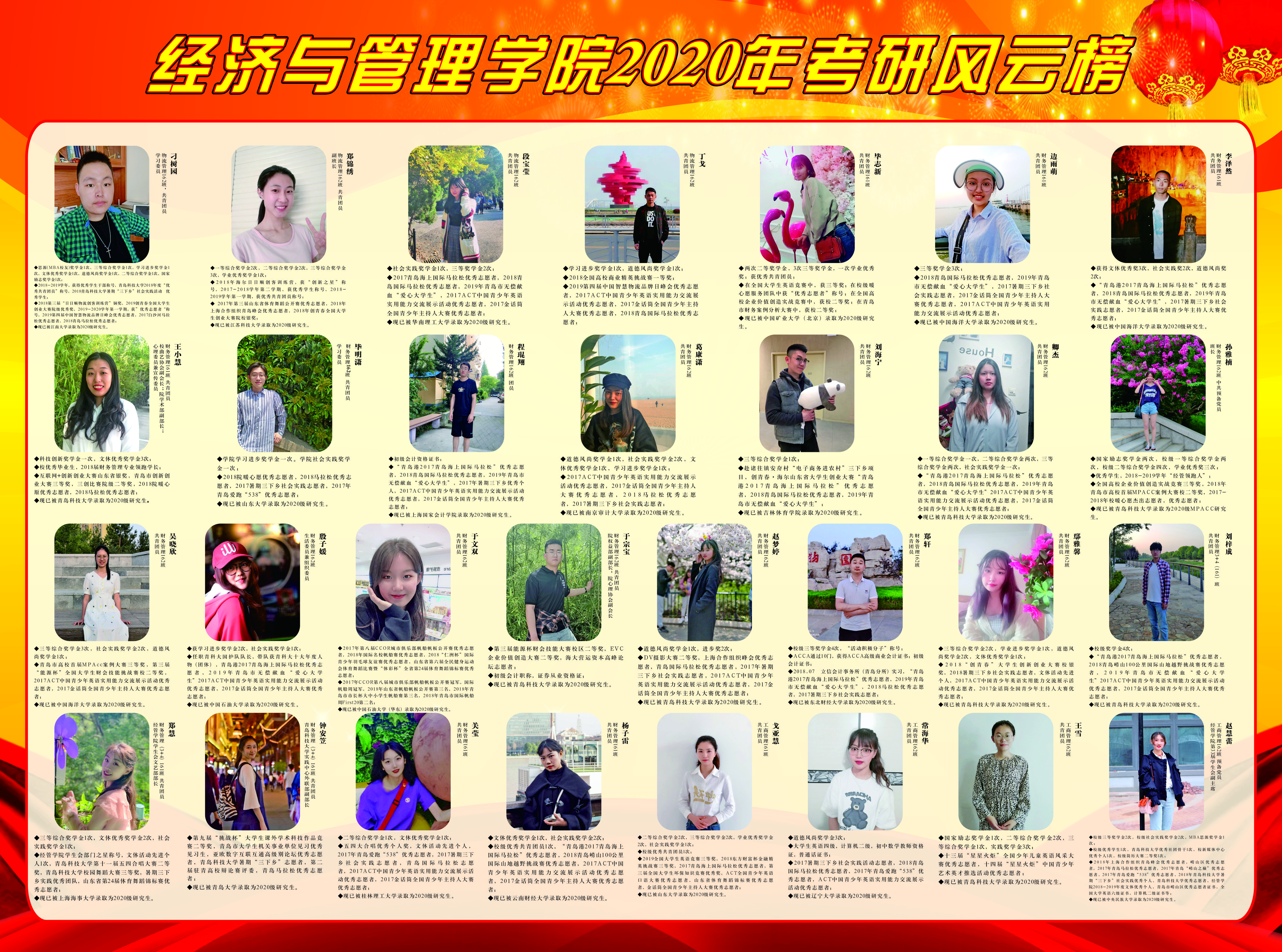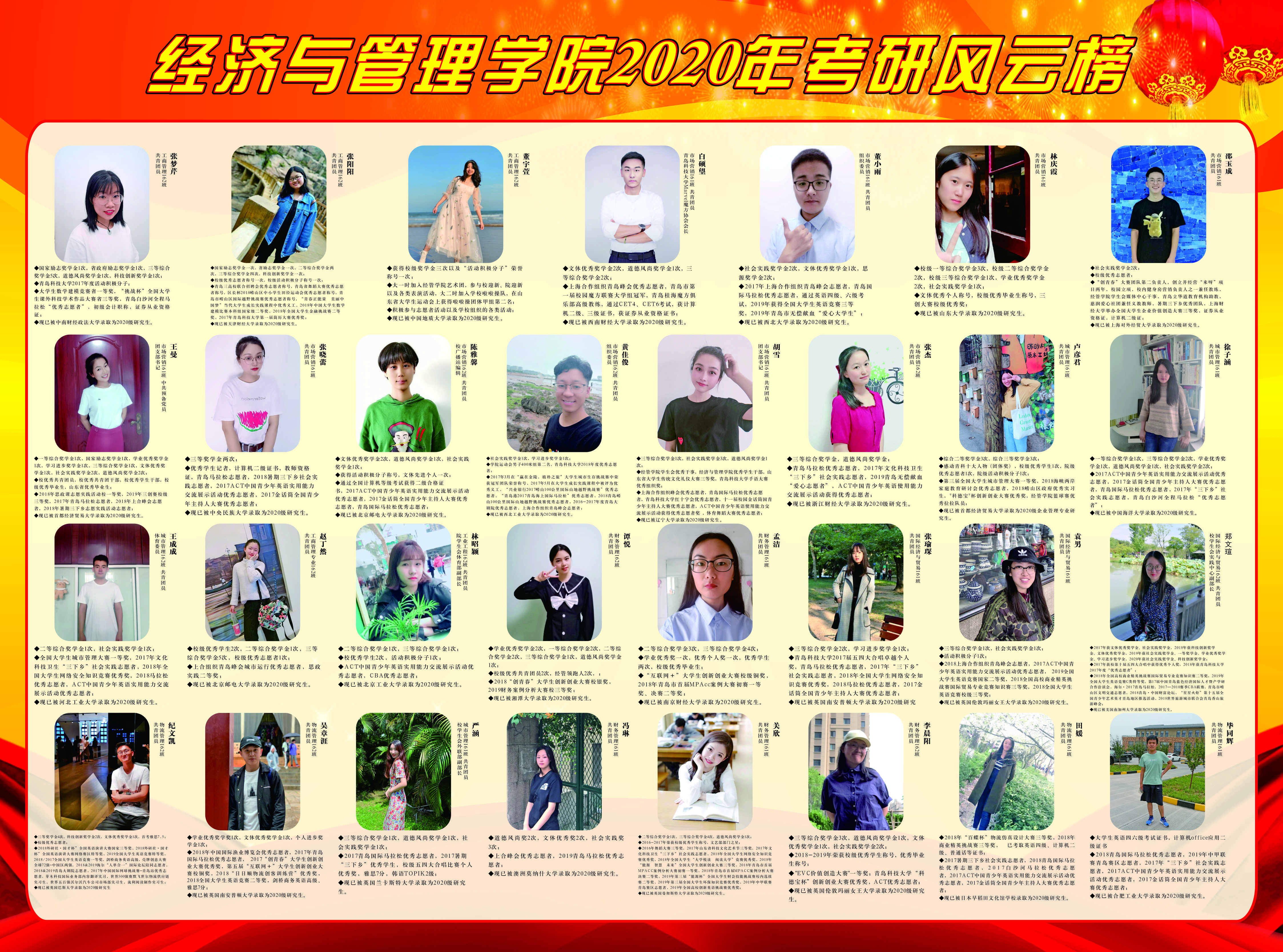 日前,2020年全国硕士研究生招生录取工作落下帷幕,冰球官网考研喜报频频传来,在全体师生的共同努力下,冰球官网的考研工作较之以往又上新台阶。据统计,国内外升学最终录取人数122人,双一流高校录取人数58人,总考研率达24.94%,较去年提升近5个百分点。其中,国际经济与贸易专业考研率37.5%,工商管理专业考研率14.71%,财务管理专业考研率23.97%,工业工程专业考研率30.51%,城市管理专业考研率10.34%,市场营销专业考研率19.35%,物流管理专业考研率40.35%。为进一步夯实学院学风建设,树榜样,立标杆,营造浓厚学术氛围,特推出“考研风云榜”展示活动,具体如下: