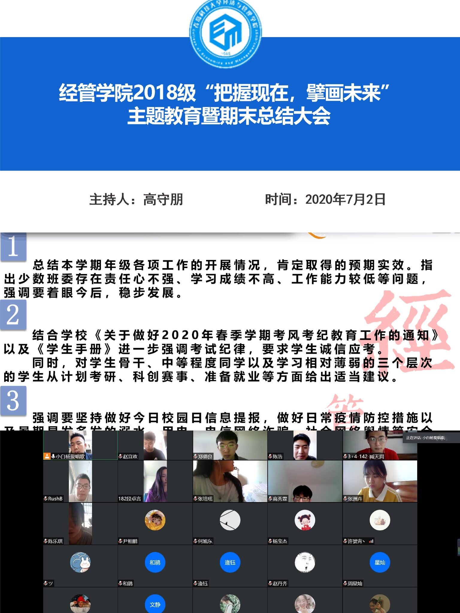 为增强学生暑期安全意识,了解当前就业学习形势,及时谋划未来大学道路,推进考风教育和学风建设,贯彻落实校院两级关于期末安全文明教育和严肃考风考纪的工作要求,在结合疫情防控,年级学生尚未返校的实际形势下,7月2日,mg冰球突破豪华版网址2018级本科生通过线上分批次分专业召开“把握现在,擘画未来”主题教育暨期末安全文明教育、诚信考风考纪大会。本次会议由2018级辅导员高守朋老师主持,18级全体学生线上参加。