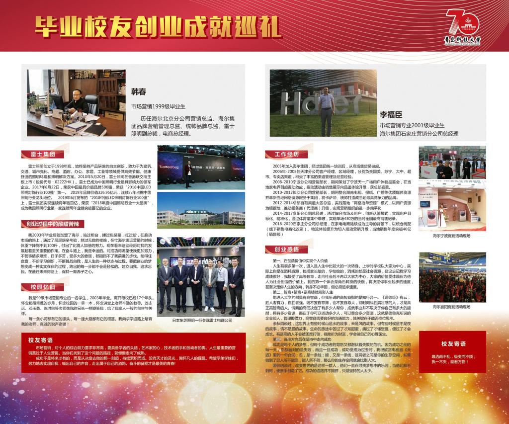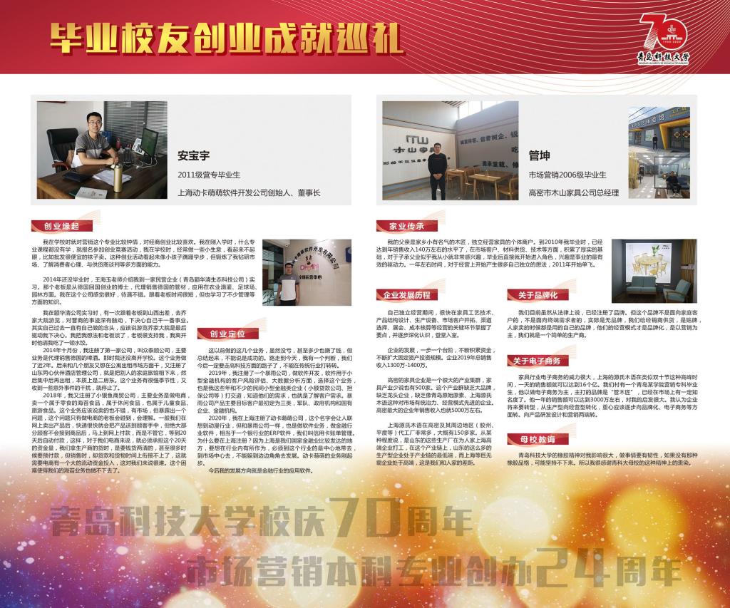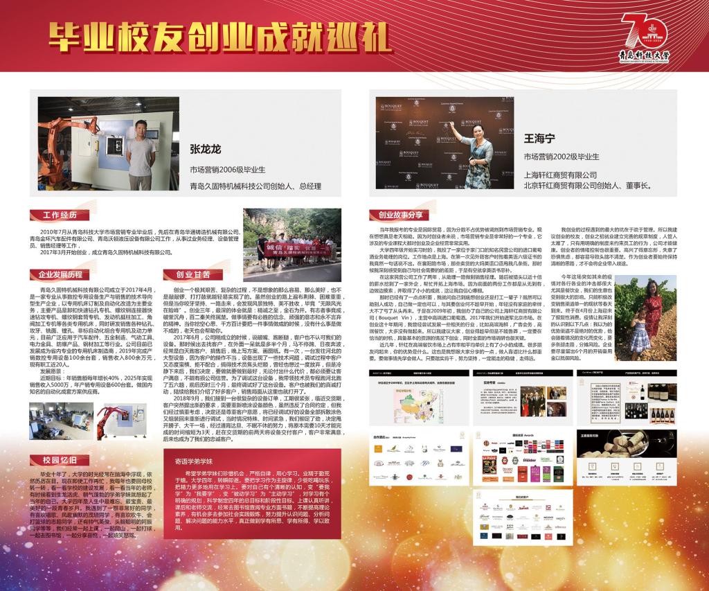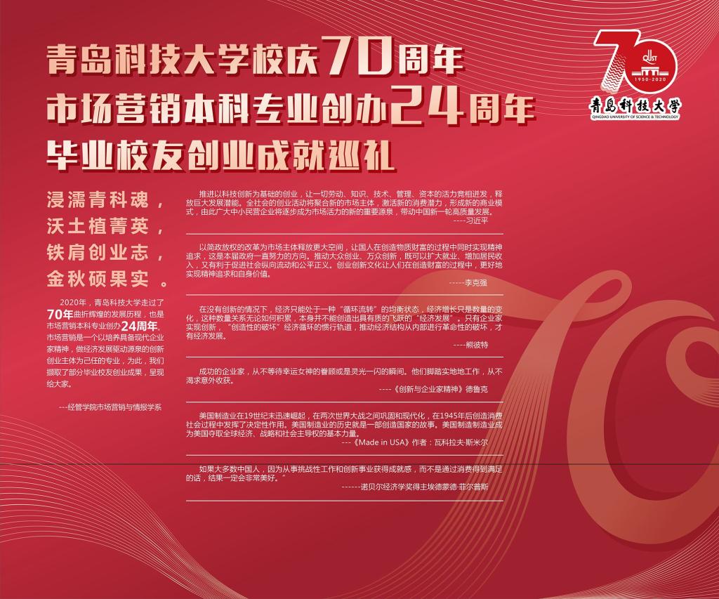 市场营销专业是一个与创业创新活动联系最为密切的应用实践性学科,其培养目标中最为重要的一点就是培养具有创业创新理念意识和技能的经营人才。展览内容丰富充实,既有毕业伊始职业生涯初期的莽撞探索,也有创业萌芽时期的筚路蓝缕、披荆斩棘;既有取得成功的喜悦欣慰,也有对决策失败的反思启迪;既有对昔日同窗的温馨回忆,也有对师长校风的感恩感悟和对学弟学妹的贴心寄语;既有对产业发展的真知灼见,也有对管理堂奥的认知解读。展览意在激发同学们的技能导向学习热情,传播开拓进取的企业家精神和持之以恒、一丝不苟的工匠精神。展示内容如下: