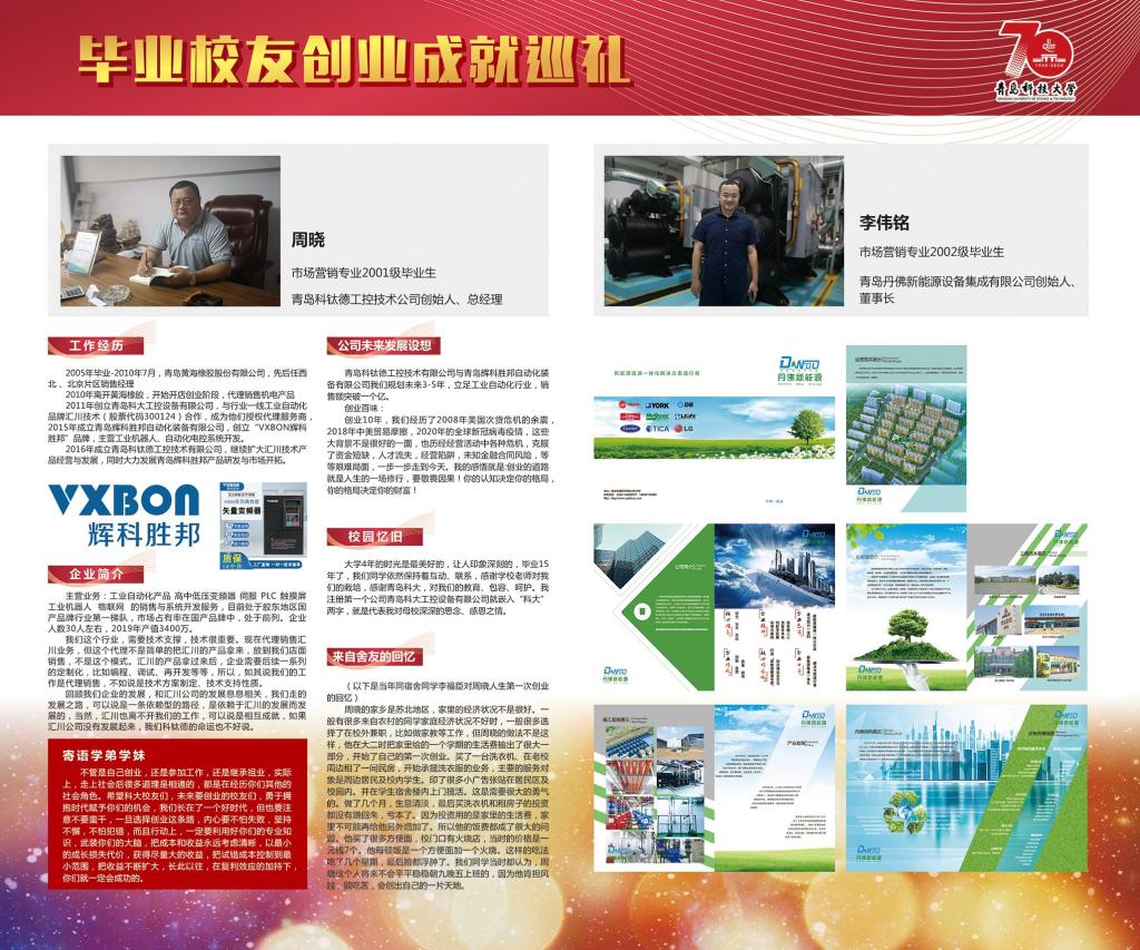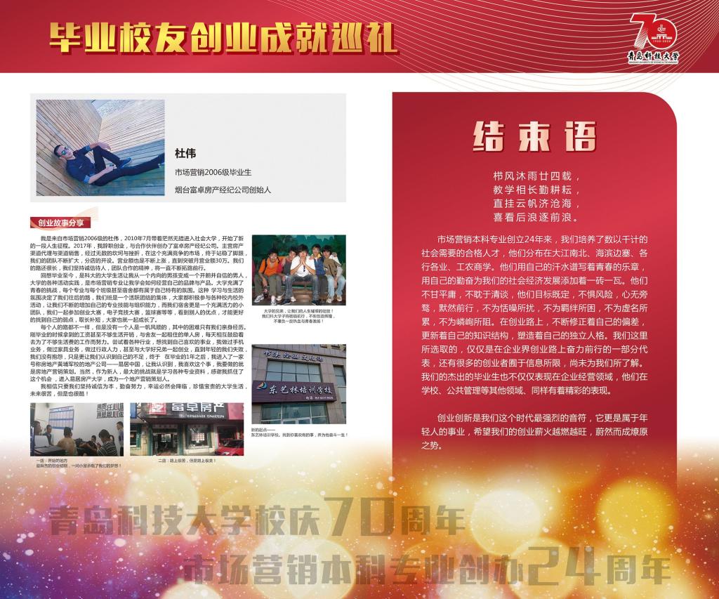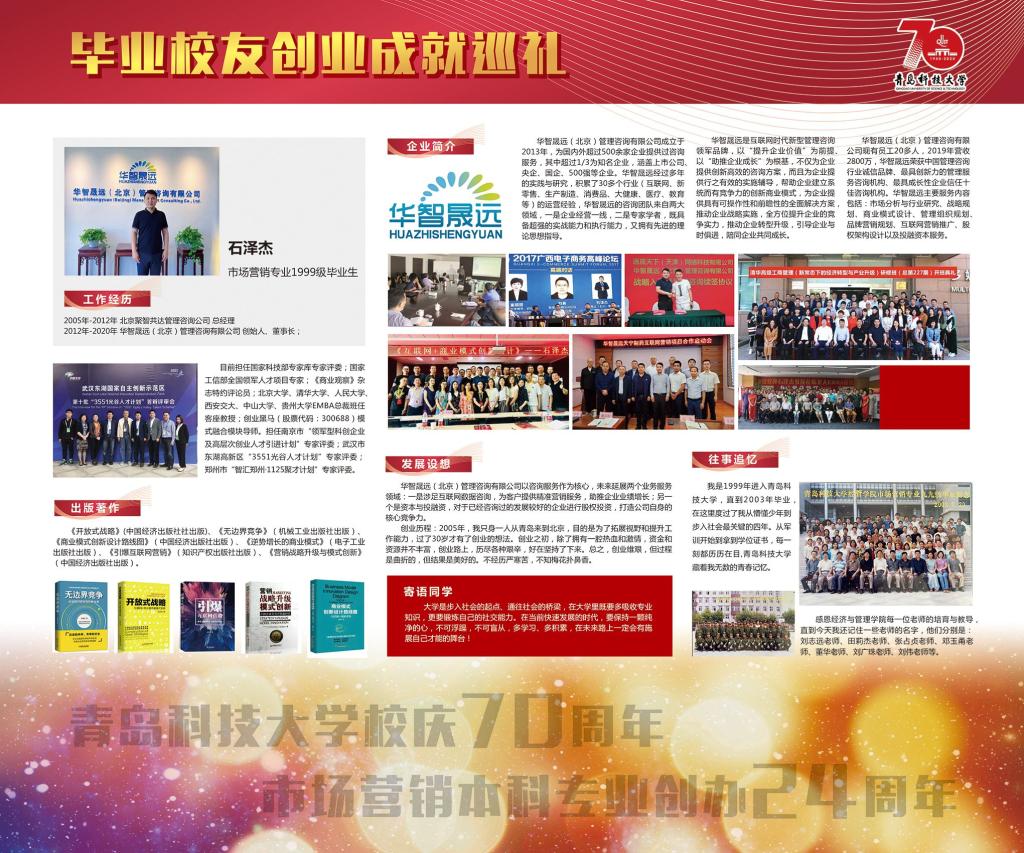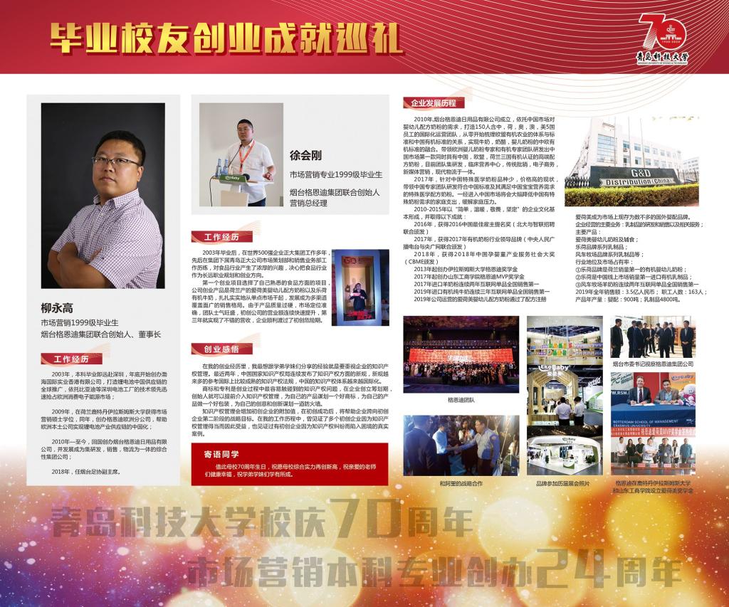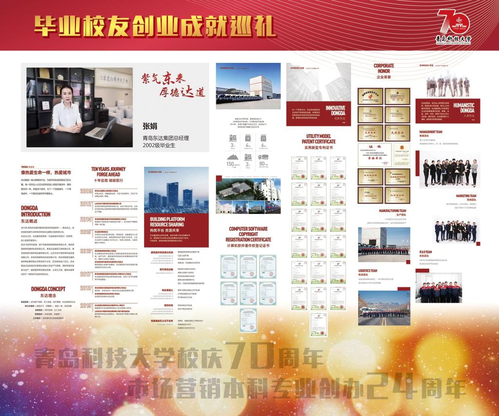 市场营销专业是一个与创业创新活动联系最为密切的应用实践性学科,其培养目标中最为重要的一点就是培养具有创业创新理念意识和技能的经营人才。展览内容丰富充实,既有毕业伊始职业生涯初期的莽撞探索,也有创业萌芽时期的筚路蓝缕、披荆斩棘;既有取得成功的喜悦欣慰,也有对决策失败的反思启迪;既有对昔日同窗的温馨回忆,也有对师长校风的感恩感悟和对学弟学妹的贴心寄语;既有对产业发展的真知灼见,也有对管理堂奥的认知解读。展览意在激发同学们的技能导向学习热情,传播开拓进取的企业家精神和持之以恒、一丝不苟的工匠精神。展示内容如下: