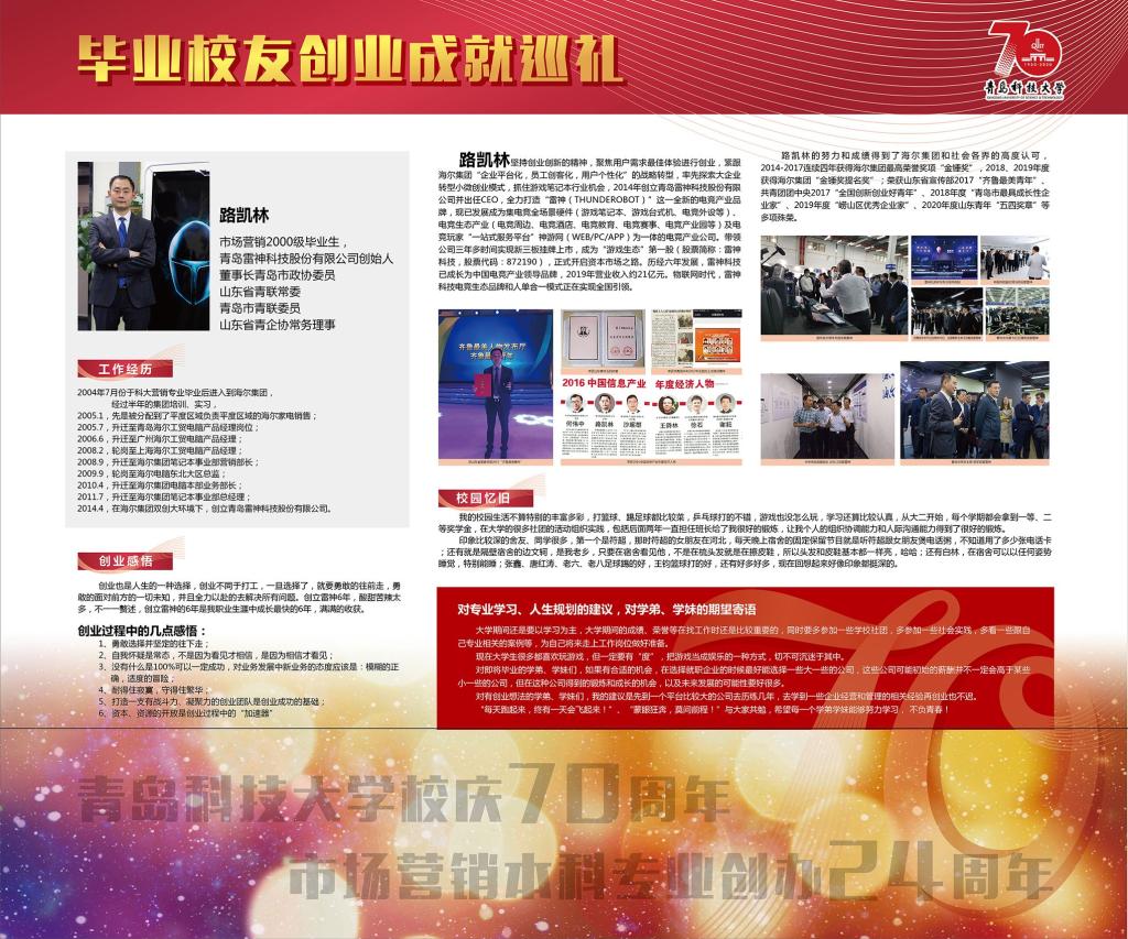 值此校庆70周年之际,冰球官网市场营销本科专业创办满24周年,为此,mg冰球突破豪华版网址市场营销系举办了毕业校友创业成就展览,收集了历届校友创业创新活动取得杰出成就的部分素材,制作展览栏于弘毅楼门口进行集中展示。
