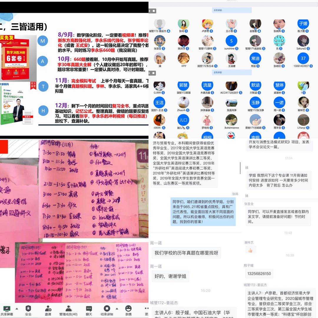 待分享结束后,同学们积极踊跃地向优秀前辈请教问题,求知若渴的寻找内心对于考研的答案。整个分享会互动频频、干货满满,一个个持之以恒的考研故事,一颗颗明亮炽热的心,给大家带来了一场别开生面的分享会。最后,17级辅导员张鸣老师进行简单总结,鼓励同学们像优秀榜样学习,做到目标坚定,执行到位,用坚持、执着和拼搏为自己赢得一个全新的起点。本次线上分享会及时有效地为即将考研的同学提供了宝贵的经验,加深了同学们对考研过程的认识,给立志考研的同学指引了方向,提供了动力。