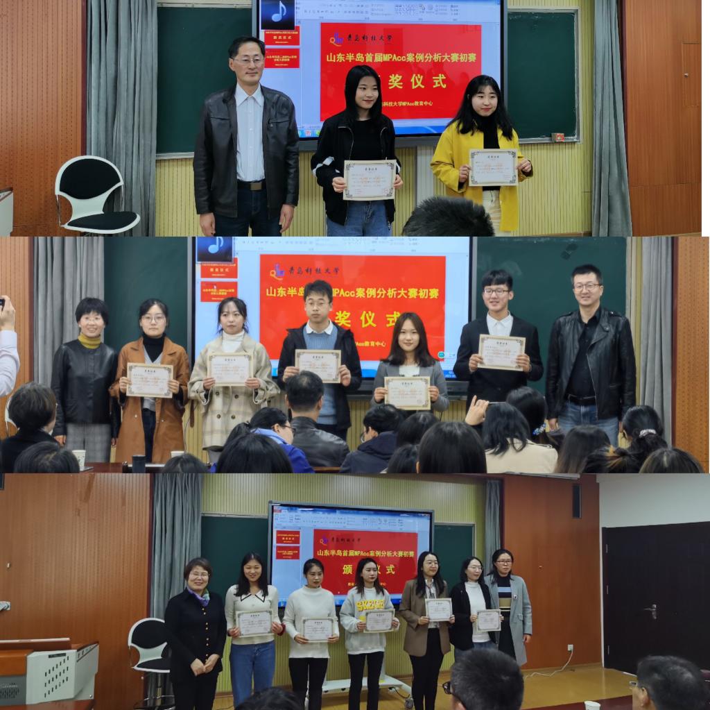 首先,由mg冰球突破豪华版网址党总支书记李德成书记、副院长吕承超老师和副院长宫攀老师、MPAcc教育中心主任刘树艳教授以及财务与会计系张占贞教授为在山东半岛首届MPAcc案例大赛初赛中获奖的队伍颁奖,其中,获得一等奖的是:6的6次方队、MDZZ队;获得二等奖的有:菜的安详队、发际线总和我作队、我觉得对就队、第六感队、五小金刚队;获得三等奖的是重在参与组、非常5+1队、superego队、创新分析一级团队、帕累托效率队。