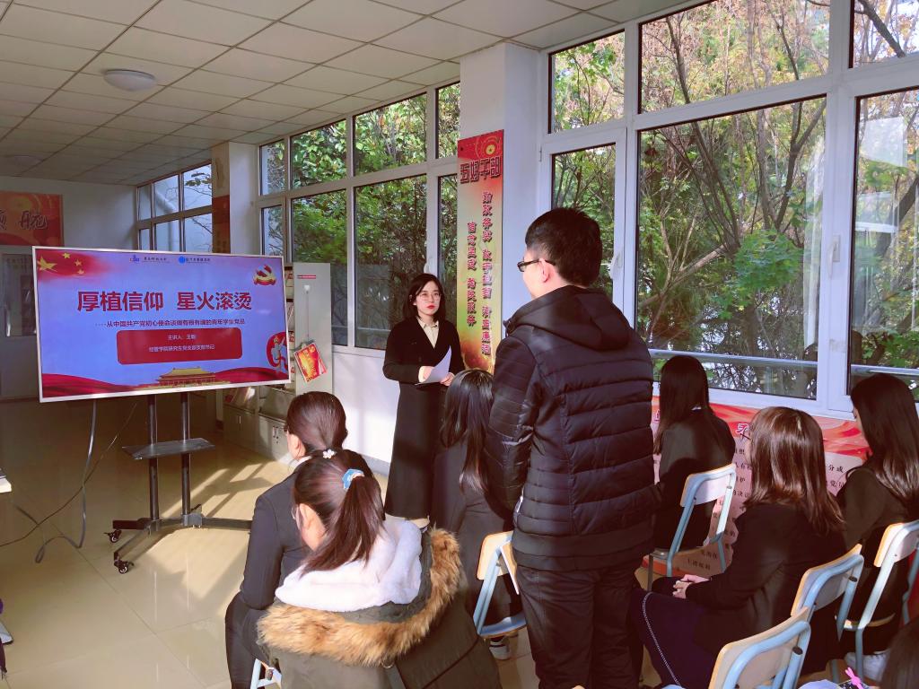 星火汇初心,青春肩使命。mg冰球突破豪华版网址研究生党支部书记王聪以“厚植信仰、星火滚烫”为主题,以十九届五中全会及“四史”教育中红色资源为依托,以“党的旗帜、党的历史、党的擘画”三个方面为切入点,重点阐述了马列主义、毛泽东思想、邓小平理论、“三个代表”重要思想、科学发展观、习近平新时代中国特色社会主义思想等理论内涵,讲述了中国共产党的发展历程和辉煌成就,从中国共产党的初心使命谈做有根有魂的青年学生党员,并在如何提高党性、如何做好党员先锋带头作用、如何将个人发展融入祖国新时代发展建设中做出引导启迪。同时,王聪以浅谈初心使命为契机,激励青年党员加强思想淬炼和政治历练,强化理想信念教育和对党忠诚教育,增强“四个意识”、坚定“四个自信”、做到“两个维护”,在贯彻落实习近平总书记重要讲话、重要批示精神的生动实践中提升新时代党员政治素养、理论水平、专业能力、实践本领。