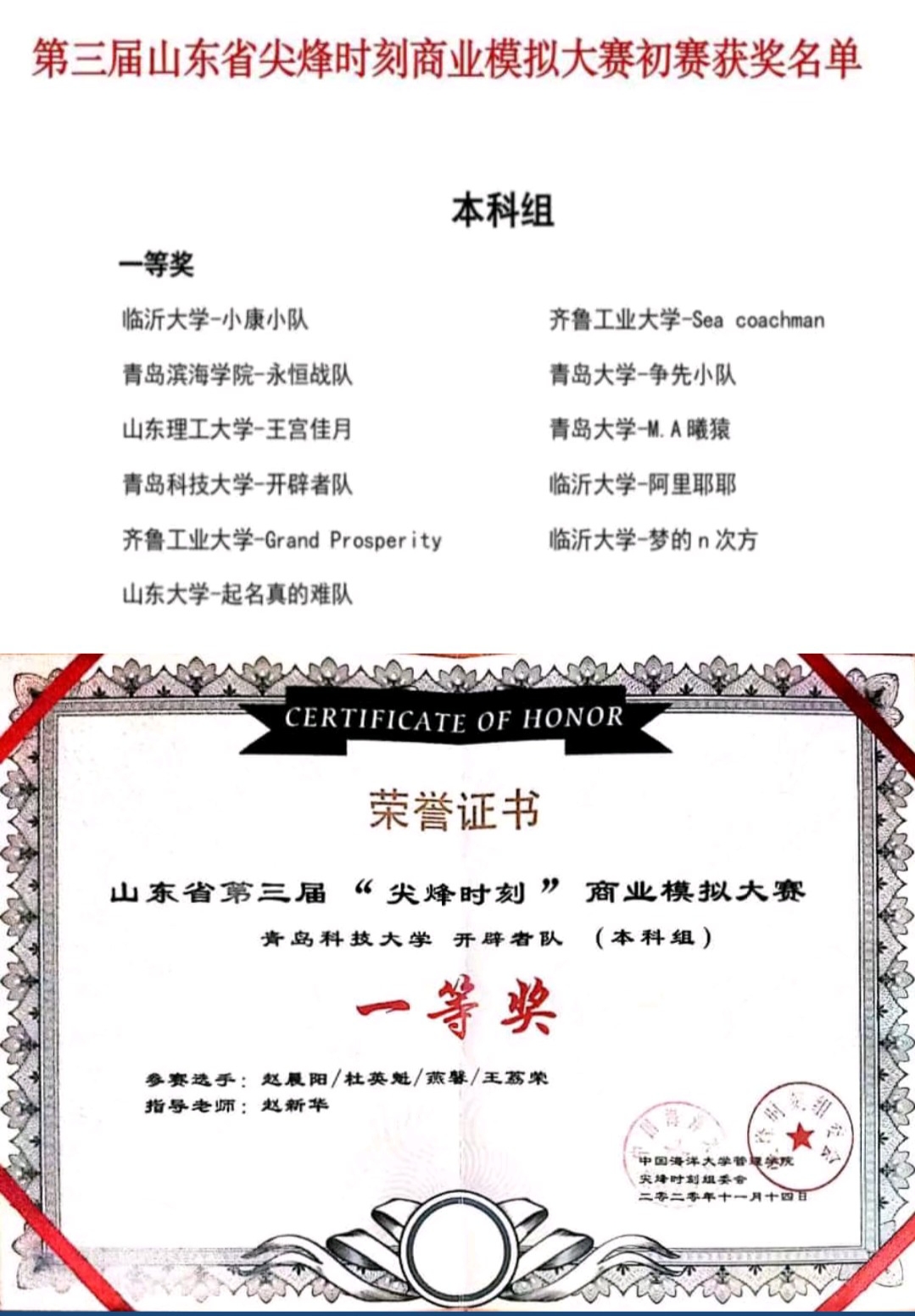 在今年山东省的比赛中,共有88支来自山东大学、中国海洋大学等全省各大高校的本科组队伍参赛。我校mg冰球突破豪华版网址“开辟者队”队员赵晨阳、杜英魁、燕馨、王荔荣在赵新华老师的指导下,经过激烈的角逐,最终以小组第一的成绩在初赛中脱颖而出,并晋级决赛。受疫情影响,本次总决赛全程网络进行,共分为商业模拟决策、商业展示、团队海报制作三个部分。在决赛中,“开辟者队”戒骄戒躁、独立思考、不断探索,展现了出团队协作与经管风采,充分体现“五有”科大人的精神风貌和学院在专业建设与人才培养方面取得的高质量成果。