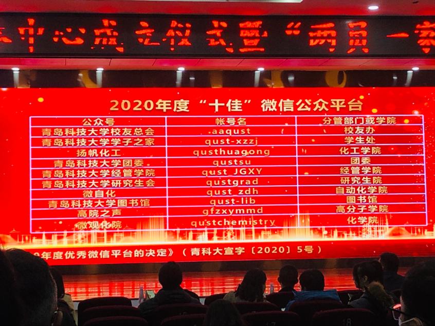 根据《关于表彰2020年度“十佳”微信公众平台的决定》(青科大宣字[2020]5号)的文件要求,本次评选依据文章总数、粉丝关注数、互动指数、阅读量、最大点击量、传播指数等综合数据展开评比。据悉,在本次微信公众平台表彰过程中涌现出一批优秀高质的微信平台,mg冰球突破豪华版网址凭借发文频率、原创文章及传播范围等因素脱颖而出,这是继喜获2018年度“新闻宣传先进单位”荣誉以来,mg冰球突破豪华版网址再次收获的又一成果。本次获奖是学校认可、学院重视、师生协同的综合结果。