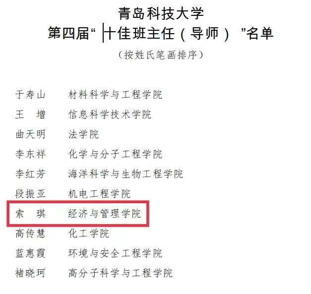据悉,本次评选经各学院(校区)考核推荐,学校选拔,并经学生评议、网络投票、学校评审并公示等环节,最终选出10名第四届“十佳班主任(导师)”。在担任班主任(导师)过程中,索琪积极投身到大学生思想政治教育和学业指导工作中,在学生思想教育、作风养成、学风建设、素质提升和班集体建设中发挥了重要作用,为促进大学生全面发展、成长成才做出了重要贡献。