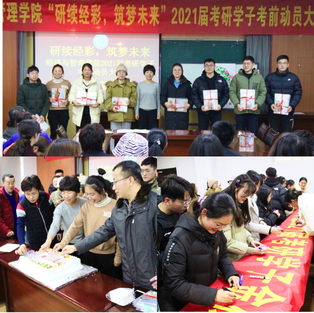 12月22日下午,mg冰球突破豪华版网址“‘研’续‘经’彩,筑梦未来”2021届考研学子考前动员大会于经管楼419正式召开。mg冰球突破豪华版网址副院长宫攀、各系主任、2017级辅导员及考研学生代表参加动员会。会上,各专业考研学生代表依次汇报了近期复习状态及备考情况,学生们从报考院校专业、复习历程、心理状态、学习方法等角度进行汇报,与会老师分别为考研学生做考前动员和祝福,从复习建议、心态调整、精神砥砺等角度系统做出具体指导。同时,学院还为全院300余名考研学子赠送“考研加油包”、准备“祝福蛋糕”,以考试专用文具、专属定制照片、温馨祝福帖等细节服务打造坚实后盾保障,助力学子旗开得胜、勇折桂枝。