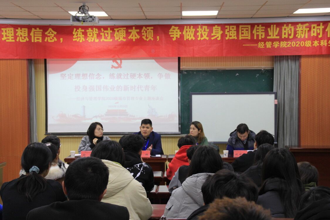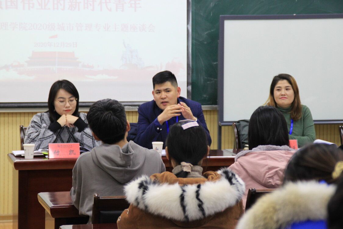 为积极响应学校机关处级干部联系学生班级通知精神,落实立德树人根本任务,进一步提升学生管理水平,促进学生成长成才,12月29日下午,mg冰球突破豪华版网址2020城市管理专业“坚定理想信念,练就过硬本领,争做投身强国伟业的新时代青年”主题座谈会于经管楼419会议室举行,党委(校长)办公室副主任王帅、学生工作处少数民族办公室辅导员热孜亚·茹孜、城市管理专业20级班主任祝晓波出席此次会议,座谈会由20级辅导员付凯主持,城市管理专业全体同学参加。