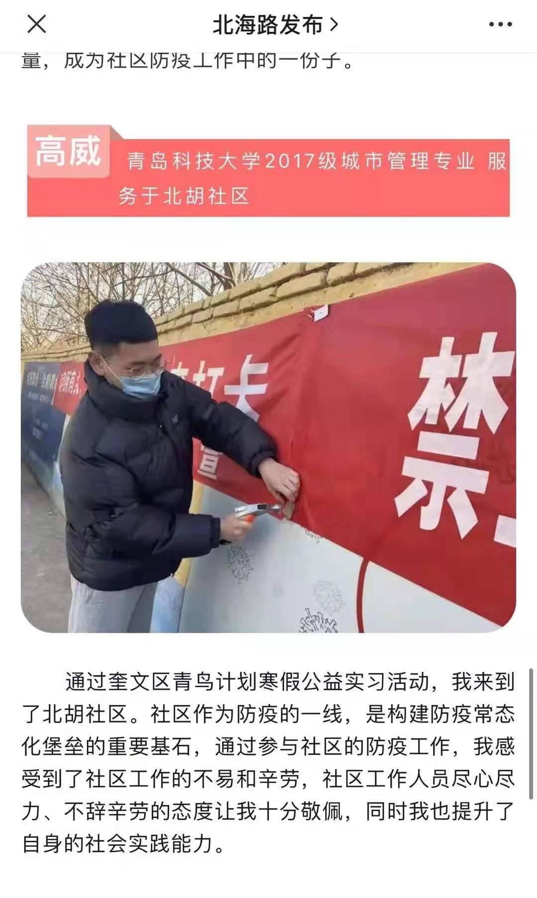 寒假时间,我积极加入潍坊市奎文区青鸟计划之抗疫志愿服务岗,从事社区一线防疫工作。在社区实习期间,我体会到了防疫工作的不易和防疫工作人员的艰辛,也锻炼了我待人接物的能力、丰富了实践经历,也让我认识到了自身的缺点和不足,这是我从学习走向工作的一笔财富,更是从学校走向社会的一次历练,更坚定了我作为党员为人民服务的决心。青年大学生更应该把有限的时间,投入到价值无限的实践中去!荣幸的是,我的服务事迹被家乡微信公众号《北海路发布》推送宣传,这是对我工作的肯定,对大学生志愿服务精神的肯定,我将始终秉持服务创新的精神,无怨无悔的坚持走向终点。