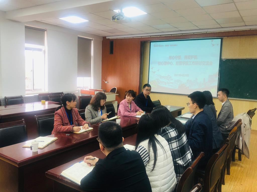 为“精细化”做好心理育人,坚持真情教育,热心服务,4月28日上午,学生处心理中心、mg冰球突破豪华版网址工作研讨交流会在经管楼419举行,学生处副处长王丽出席会议,心理中心主任李海玲,心理中心魏玉杰、王岳飞,mg冰球突破豪华版网址党委副书记兼副院长刘跃宁及全体辅导员参加了座谈。