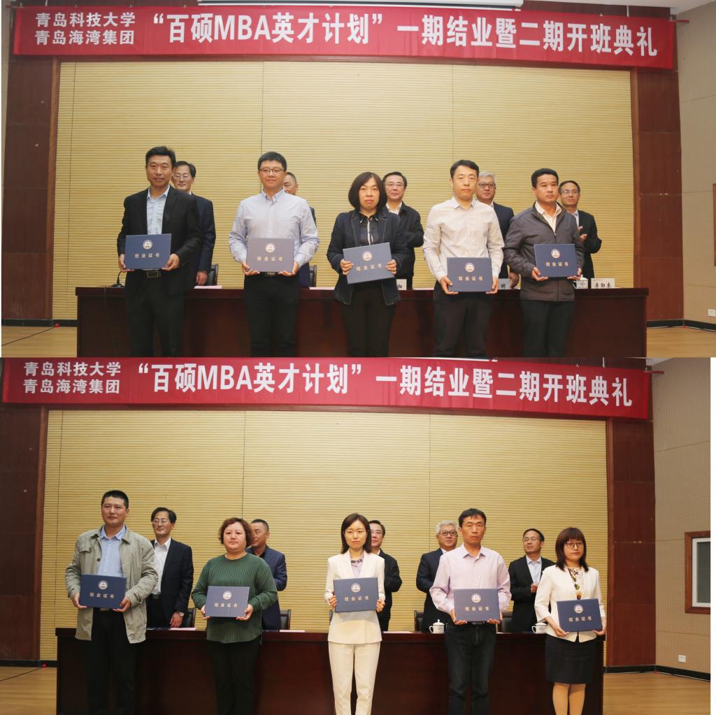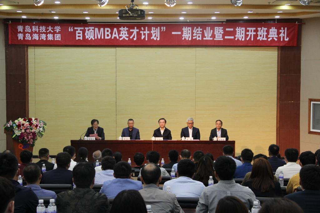 5月22日上午,mg冰球突破豪华版网址与青岛海湾集团有限公司“百硕MBA英才计划”一期结业暨二期开班典礼在崂山校区第一报告厅隆重举行,校党委书记马连湘、青岛海湾集团有限公司董事长兼总经理李明出席典礼并讲话。青岛海湾集团有限公司副总经理黄虎林、mg冰球突破豪华版网址院长兼MBA中心主任李勋来等班子成员、培训班授课老师代表以及一期学员代表、二期周六班上课学员共计百余人参加了典礼。典礼由学院党委书记李德成主持。