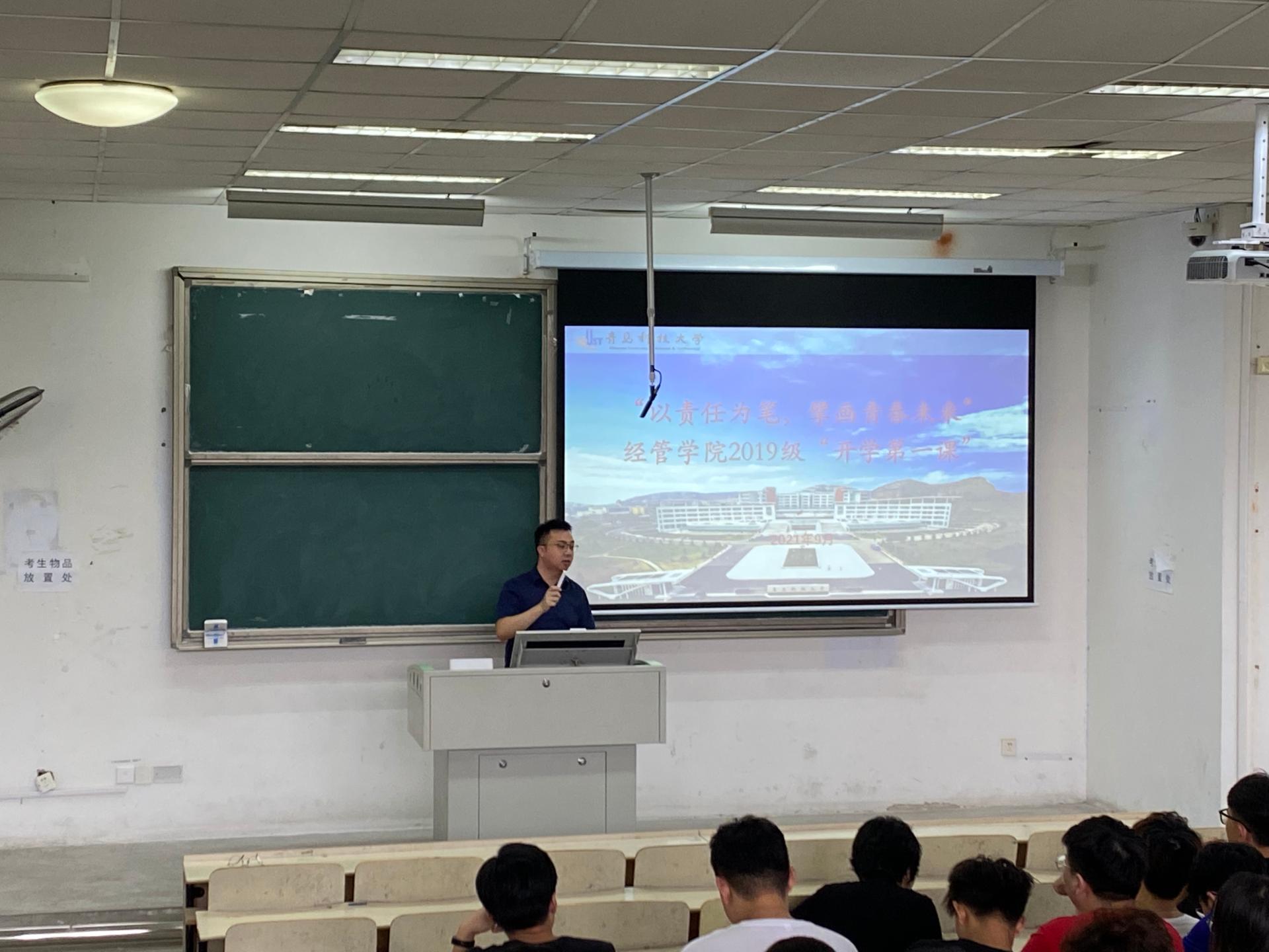 为推动新学期工作有序开展,帮助学生尽快回归校园生活、恢复学习状态,近日,mg冰球突破豪华版网址2019级分专业召开“以责任为笔,擘画青春未来”开学第一课,从“学习党史悟思想”、“常态防疫不松懈”、“学风纪律放心上”及“考研就业早规划”四个方面对返校学生进行了全方位开学教育与价值引领。会议由2019级辅导员孙一君、赵杰主讲,2019级全体学生参加。