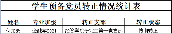 根据《中国共产党章程》和《中国共产党发展党员工作细则》及学校党委《关于发展学生党员工作的意见》(青科大党字〔2014〕77号)文件要求,mg冰球突破豪华版网址本科生党支部于2022年6月22日召开预备党员转正大会讨论何加豪同志的转正问题,同意该同志按期转为中共正式党员,现将其情况予以公示。公示期为2022年6月22日至2022年6月28日。如有异议,请于公示期内到mg冰球突破豪华版网址党委反映。